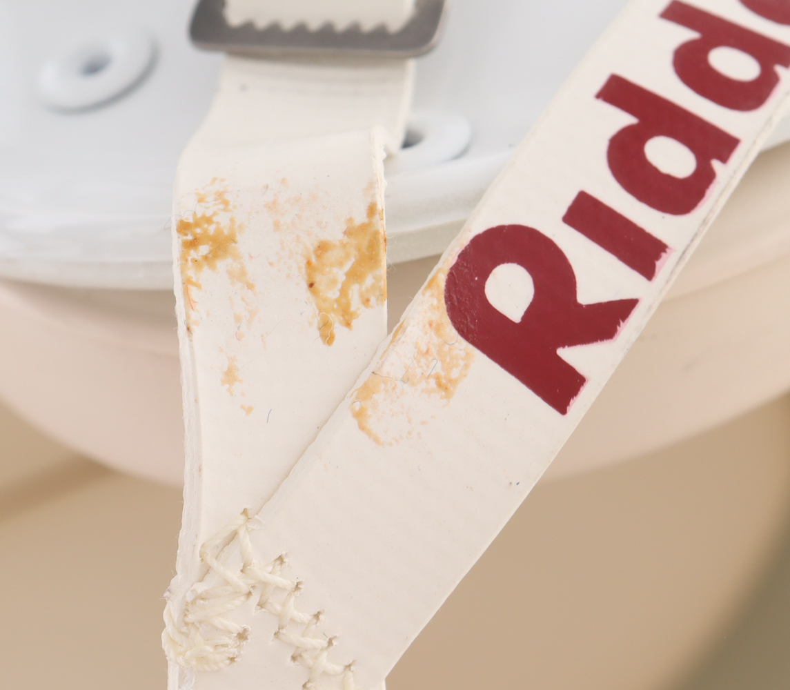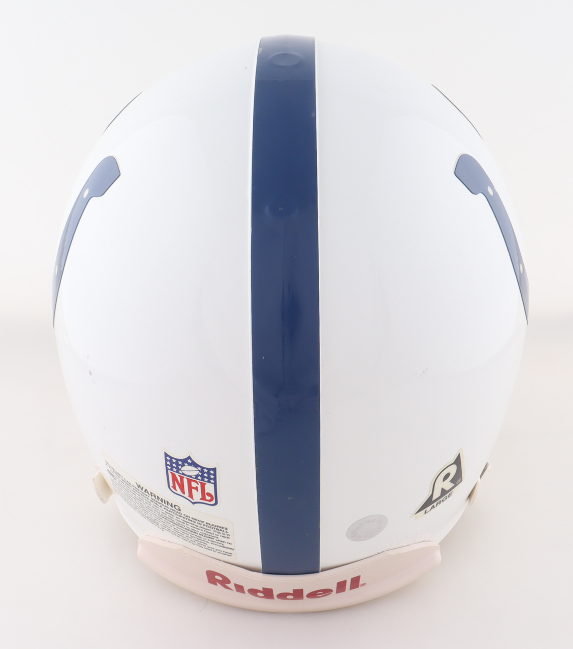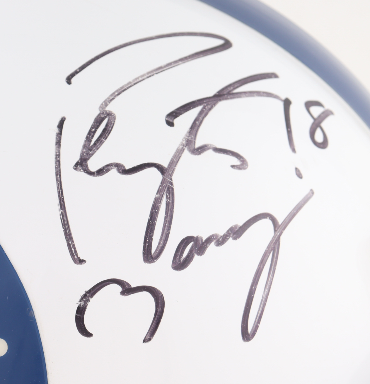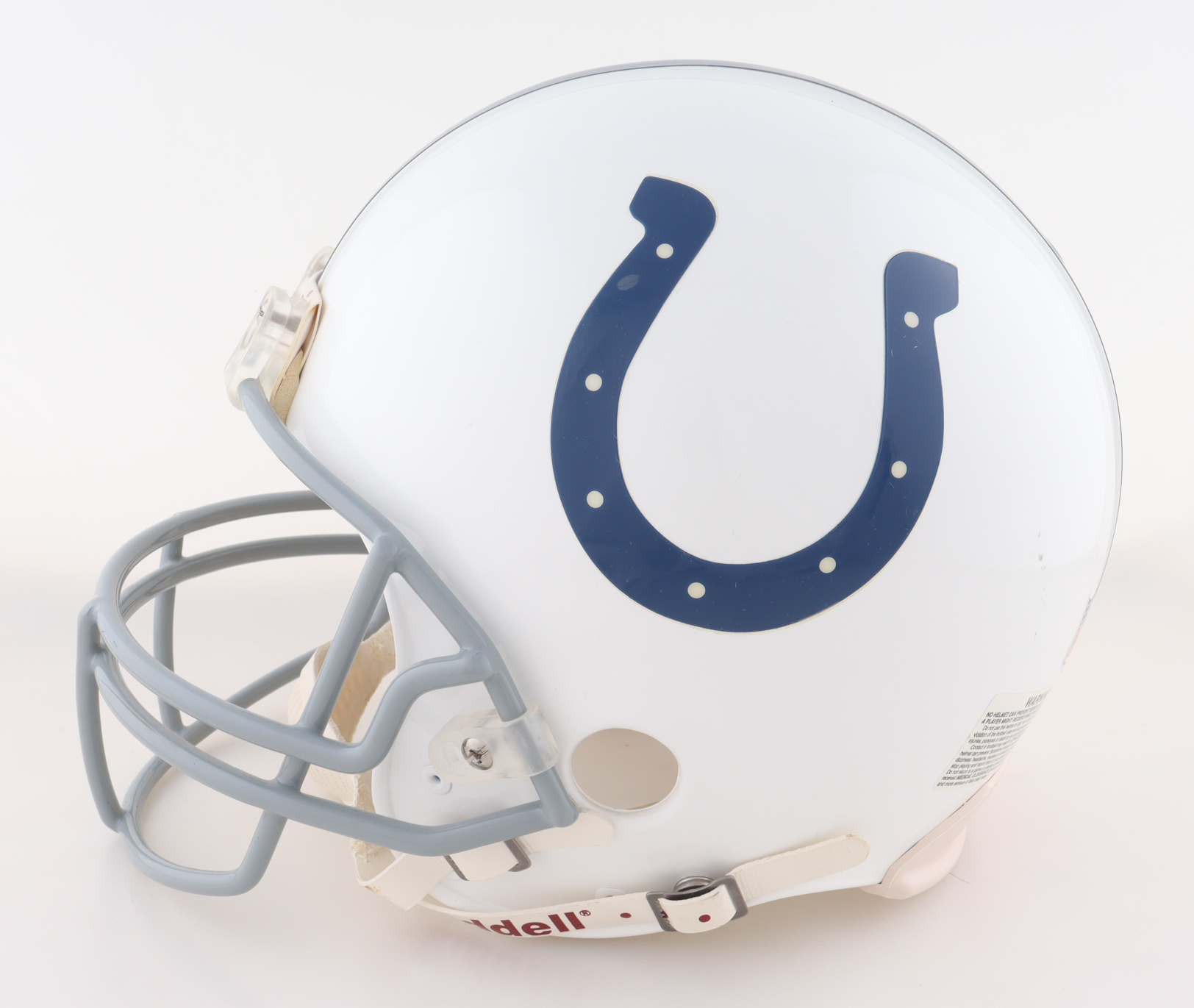 Riddell Indianapolis Colts full-size authentic on-field Pro Line helmet has been hand-signed by Peyton Manning (HOF). Please note the signature is faded, the left chin strap is stained, and there is a stain on the back left side of the helmet, see photos for more details.