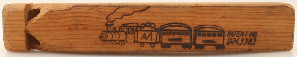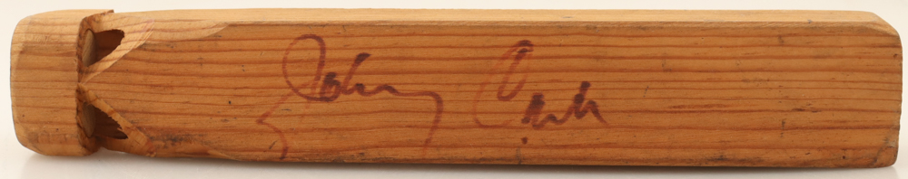 Wooden train whistle toy measures approximately 9" in length and has been hand-signed by Johnny Cash (d. 2003).