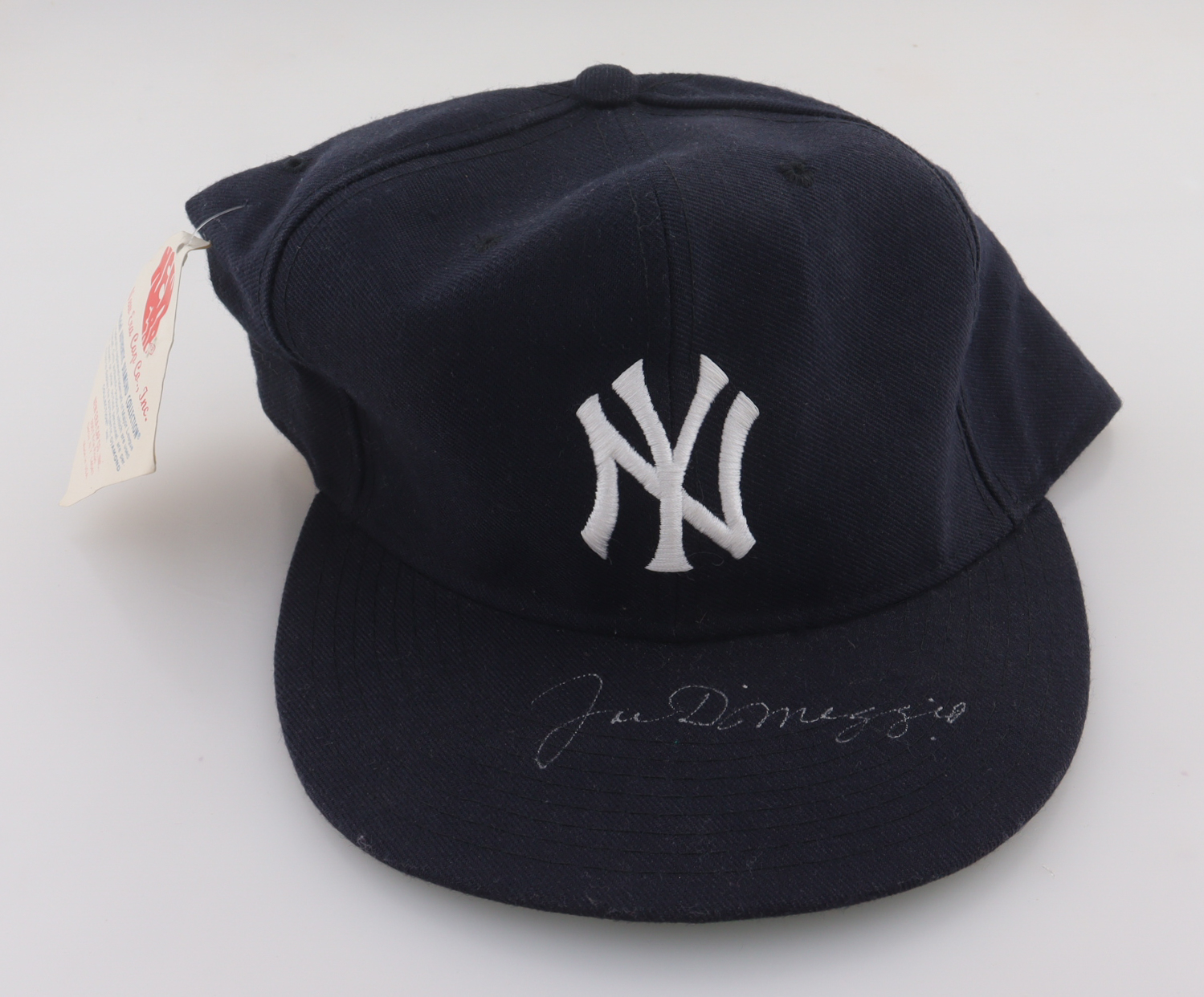 Vintage New Era New York Yankees Baseball Hat measures size 7.75 and has been hand-signed by Joe DiMaggio (D. 1999, New York Yankees, HOF).