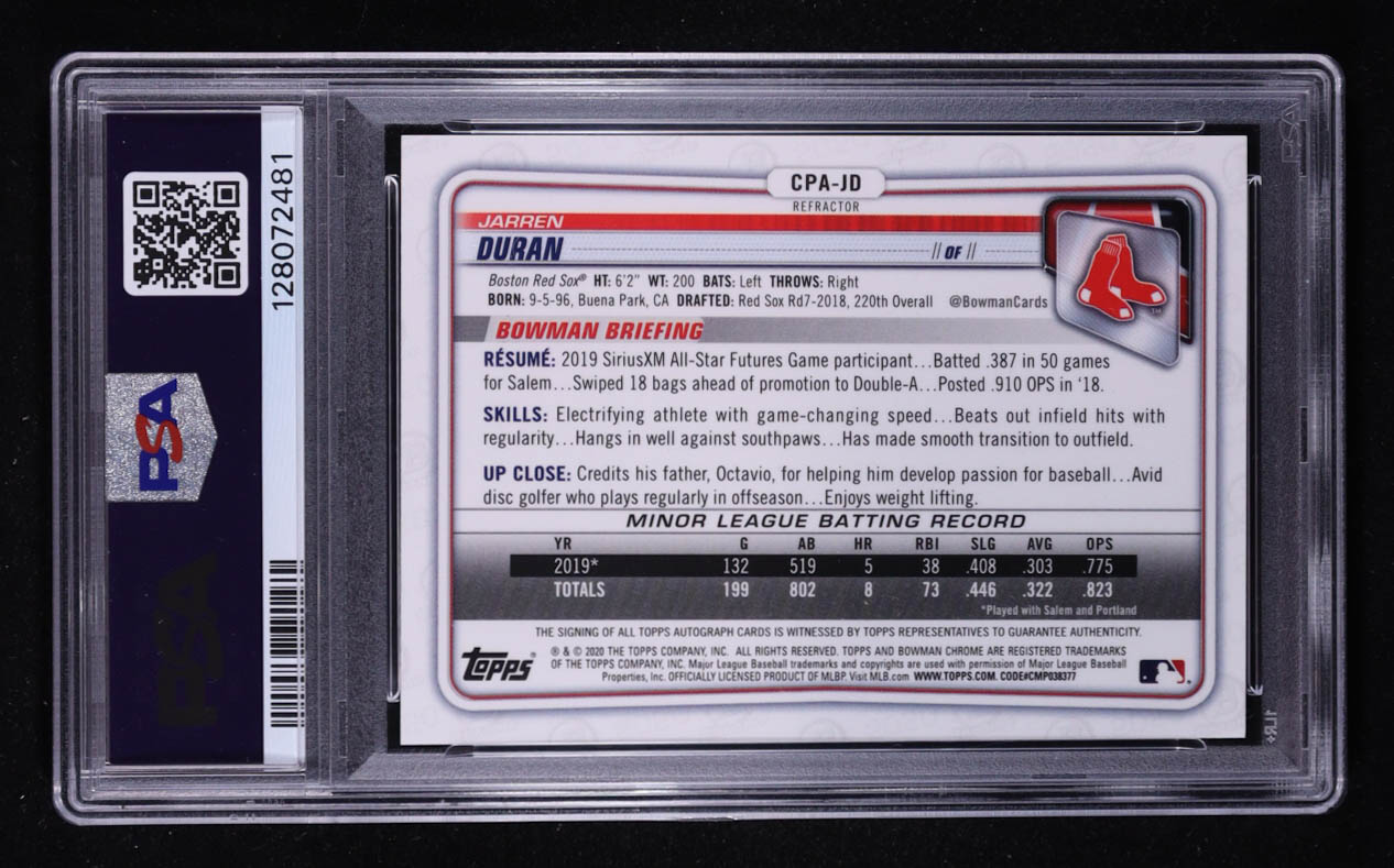 Jarren Duran 2020 Bowman Chrome Prospect Refractor Auto #CPA-JD RC #308/499 (PSA 10)