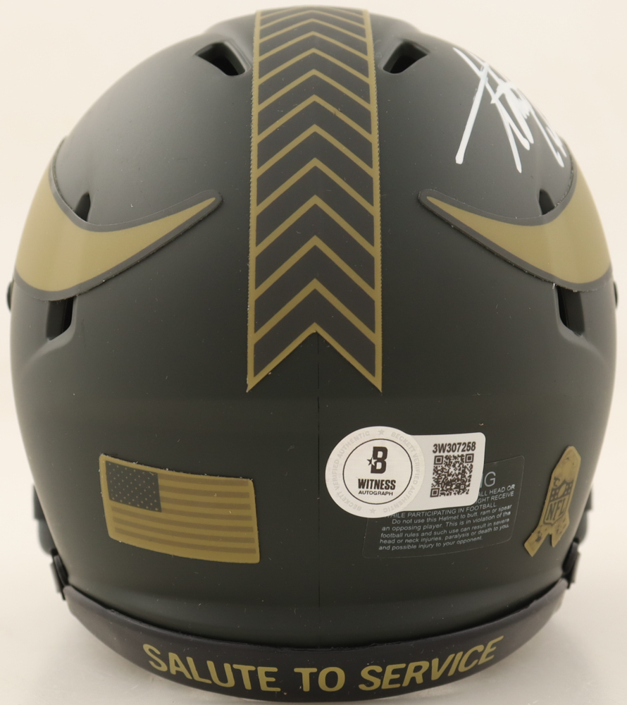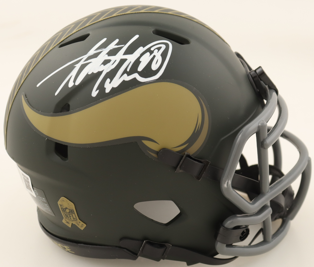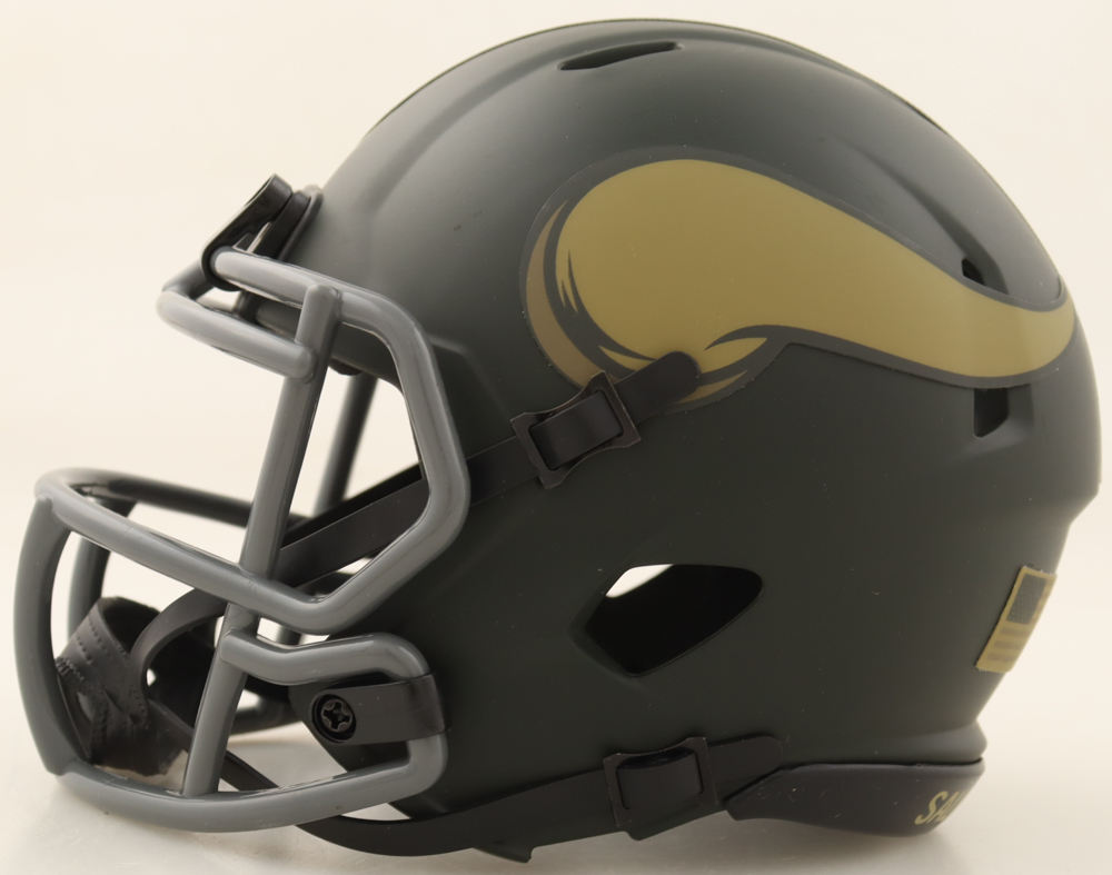 Riddell Minnesota Vikings Salute To Service Alternate Speed mini helmet. Hand-signed by Adrian Peterson.