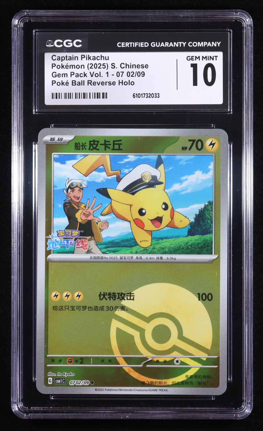 Captain Pikachu 2025 Pokemon Vol.1 Gem Pack Poke Ball Chinese #07 02 Reverse Holo (CGC 10)