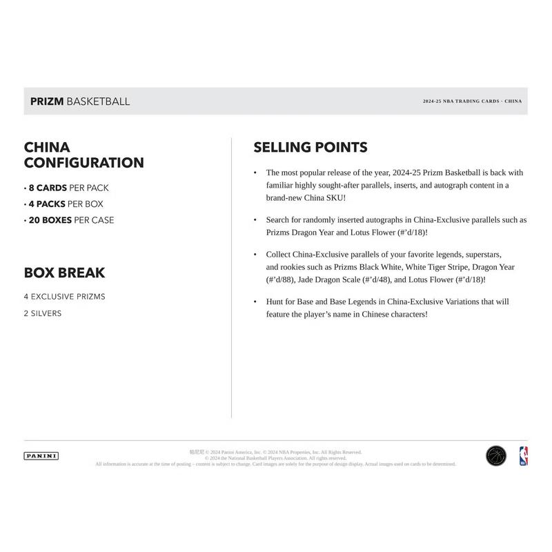 Collect China-Exclusive parallels of your favorite legends, superstars, and rookies such as Prizms Black White, White Tiger Stripe, Dragon Year (#'d/88), Jade Dragon Scale (#'d/48), and Lotus Flower (#'d/18)!