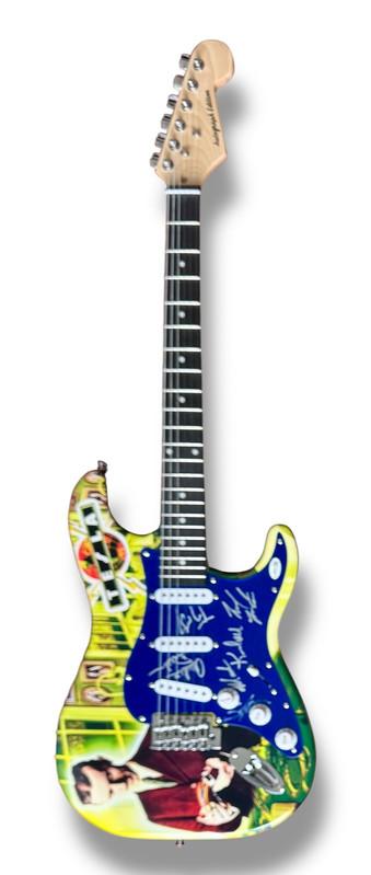 Custom Autograph Edition Stratocaster electric guitar measures approximately 39" in length and has been hand-signed on the pickguard by Jeff Keith (lead singer), Frank Hannon (lead guitarist), Brian Wheat (lead bassist), Dave Rude (rhythm guitarist), and Steve Brown (drummer).