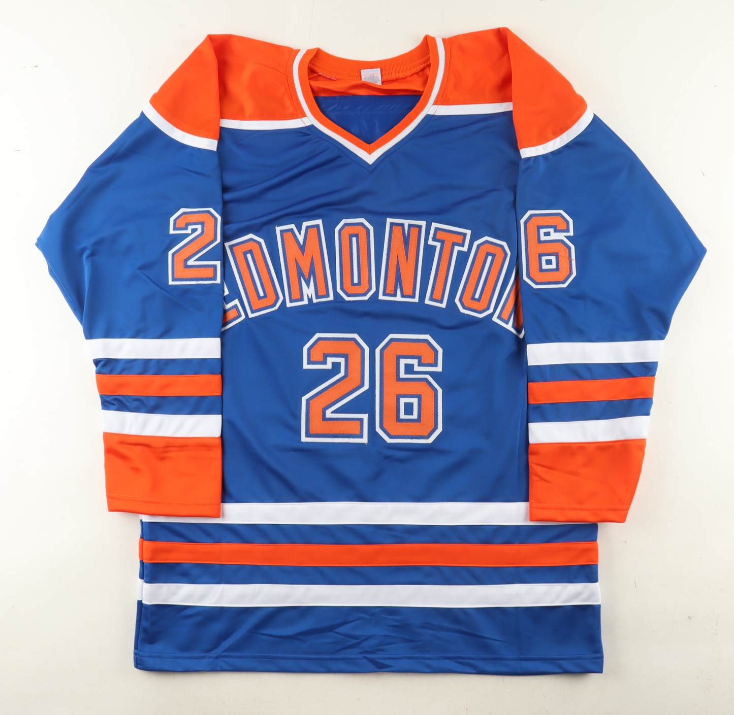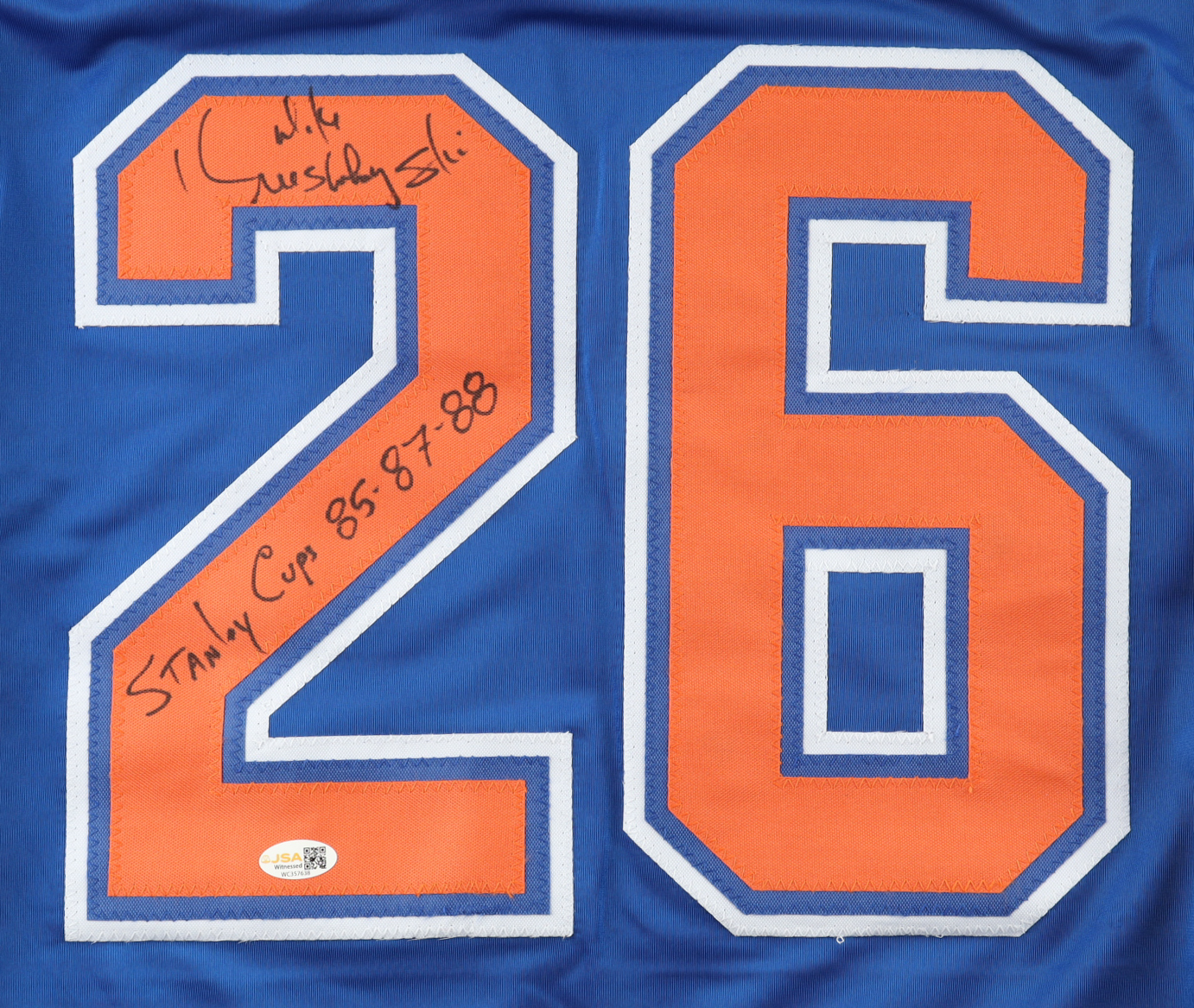 Custom jersey. Everything is sewn on, size XL. Hand-signed and inscribed by Mike Krushelnyski.