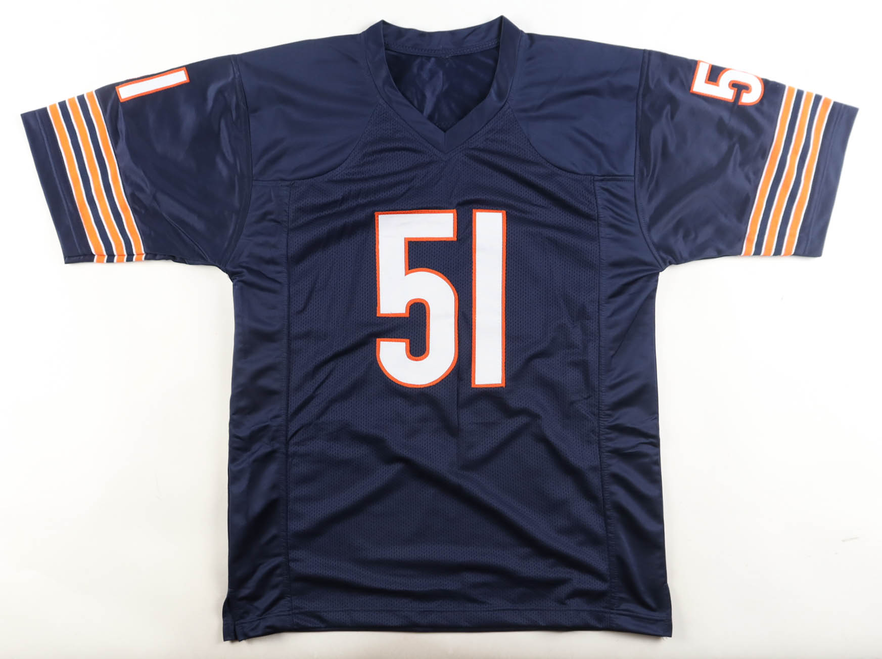 Custom jersey with everything sewn on, size XL. Hand-signed by Dick Butkus (D. 2023, HOF). Please note, glue is visible through the reverse number.