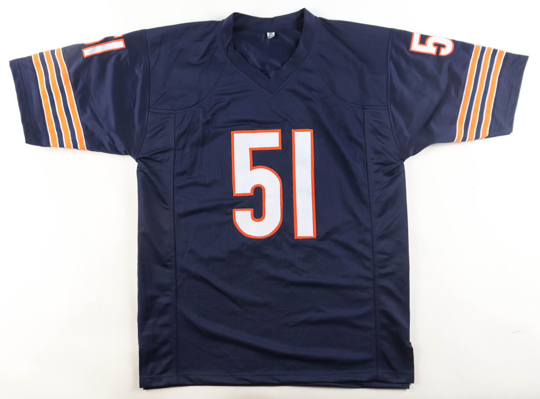 Custom jersey with everything sewn on, size XL. Hand-signed by Dick Butkus (D. 2023, HOF). Please note, glue is visible through the reverse number.