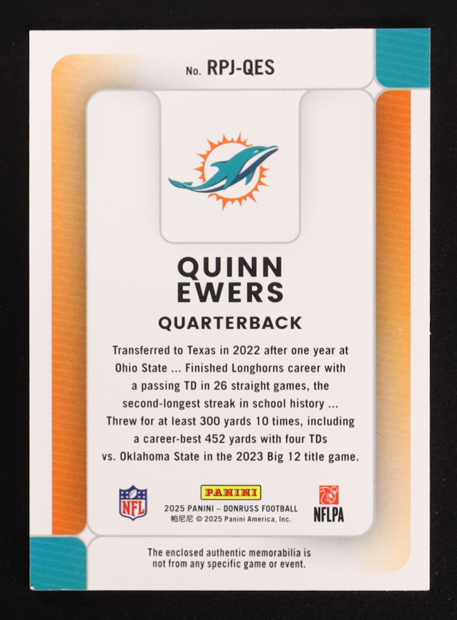 Quinn Ewers 2025 Donruss Rookie Phenom Jerseys #24 RC