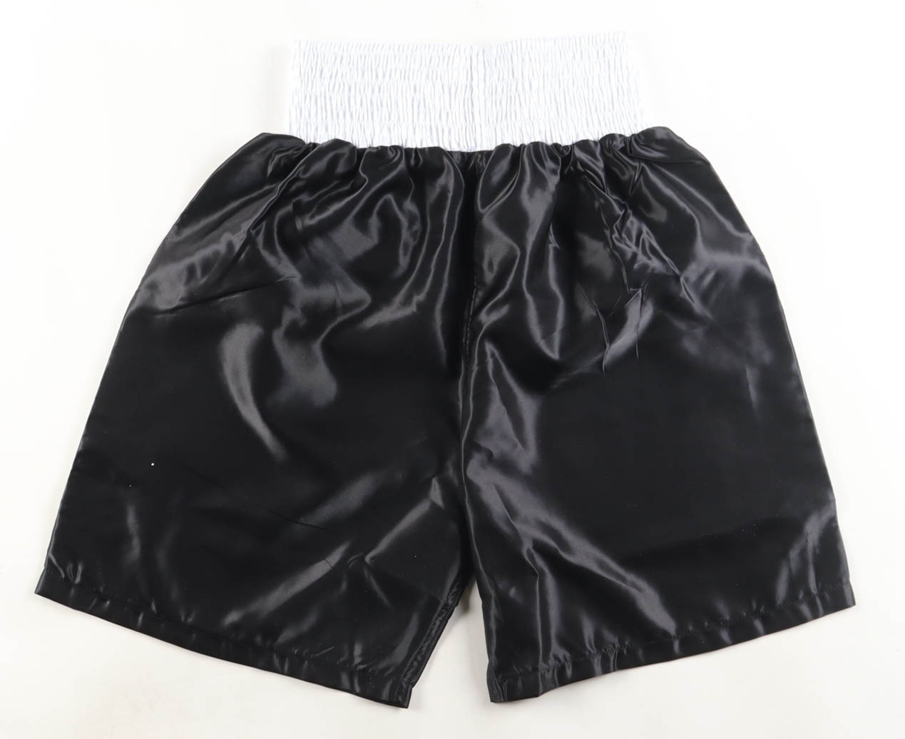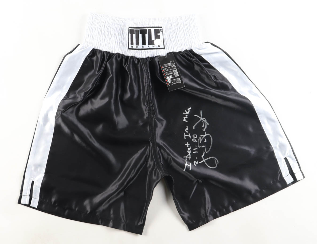 Title boxing shorts have been hand-signed and inscribed by James "Buster" Douglas.