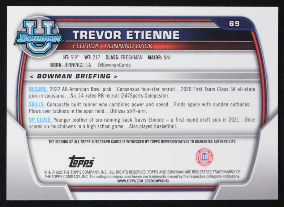 Trevor Etienne 2022 Bowman University Chrome Auto #69 RC