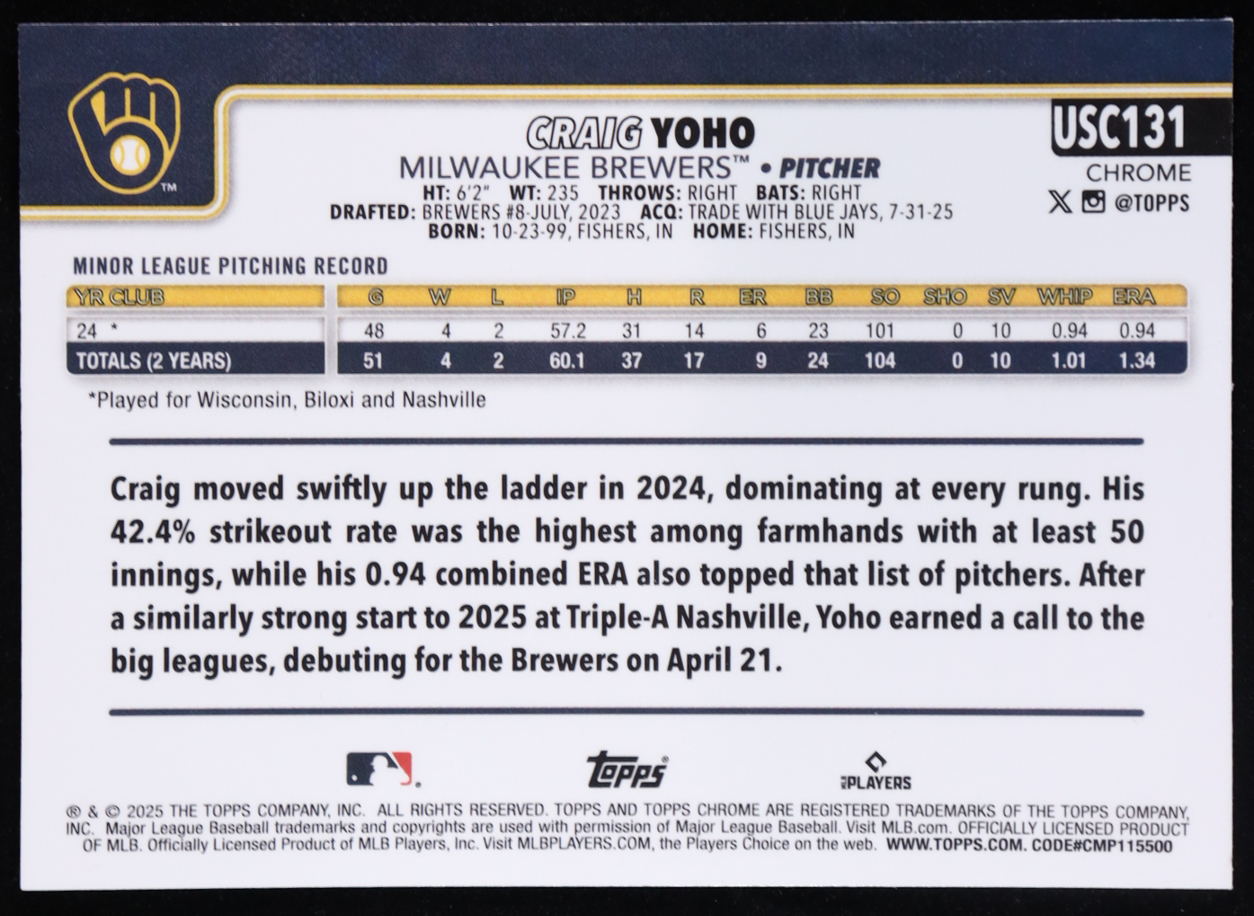 Craig Yoho 2025 Topps Chrome Update Blue Wave Refractors #USC131 #034/150 RC