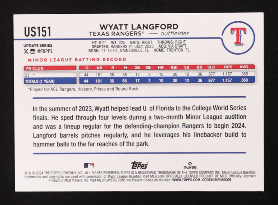 Wyatt Langford 2024 Topps Update #US151 RC