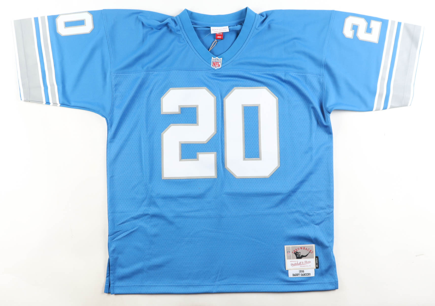 Mitchell & Ness authentic jersey with everything sewn on, size 48 (XL). Hand-signed and inscribed by Barry Sanders (Detroit Lions, HOF).