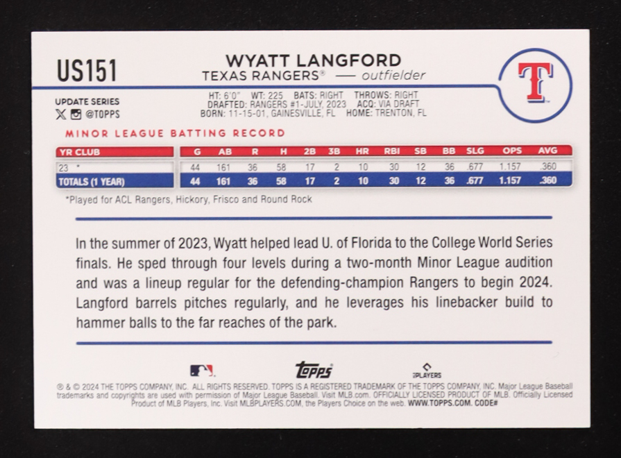 Wyatt Langford 2024 Topps Update #US151 RC