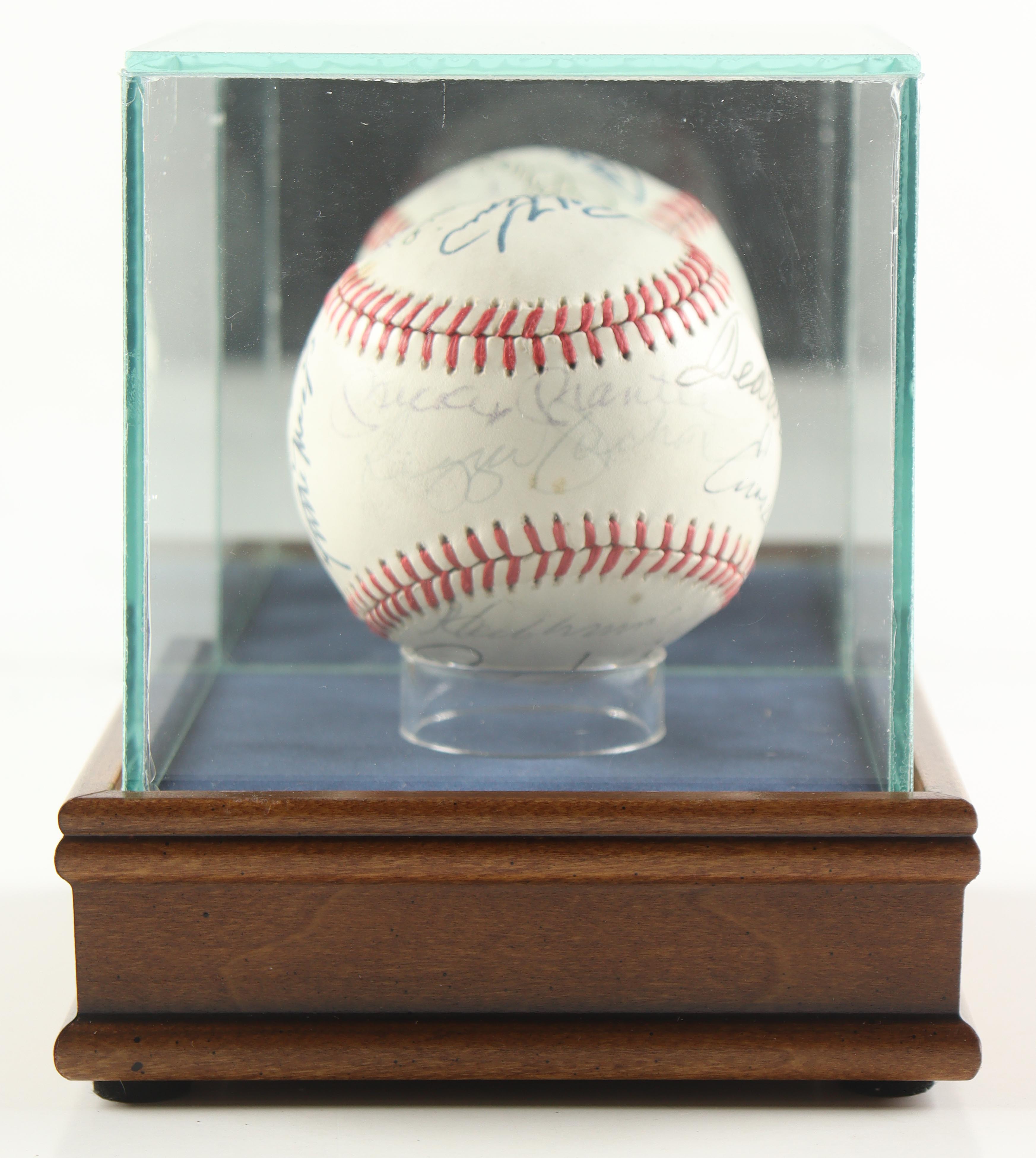 Rawlings Official American League baseball has been hand-signed by (14) of the greatest names in baseball history including Hall of Famers Mickey Mantle, Reggie Jackson, Ted Williams, and Hank Aaron! The display case is included as shown!