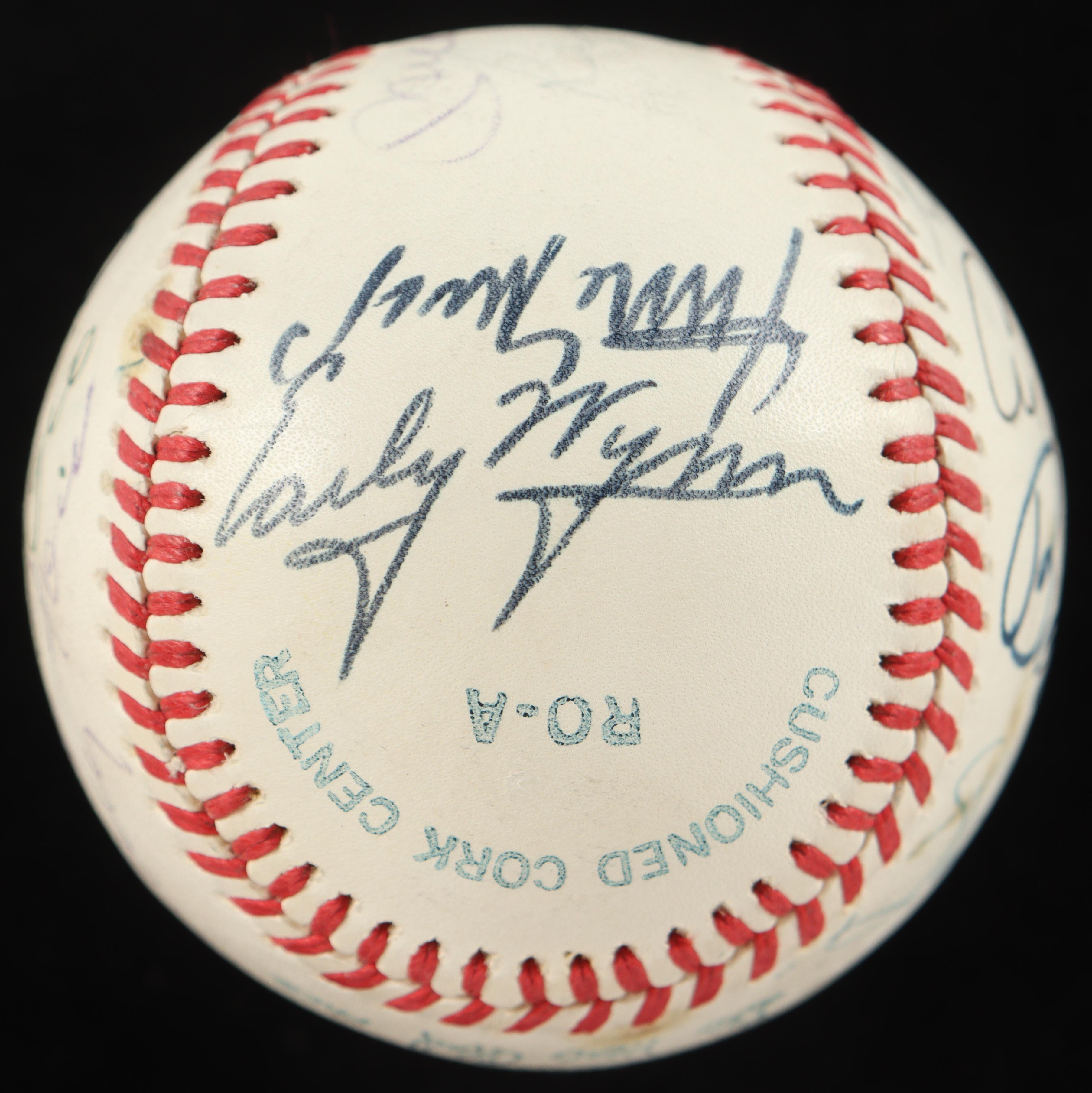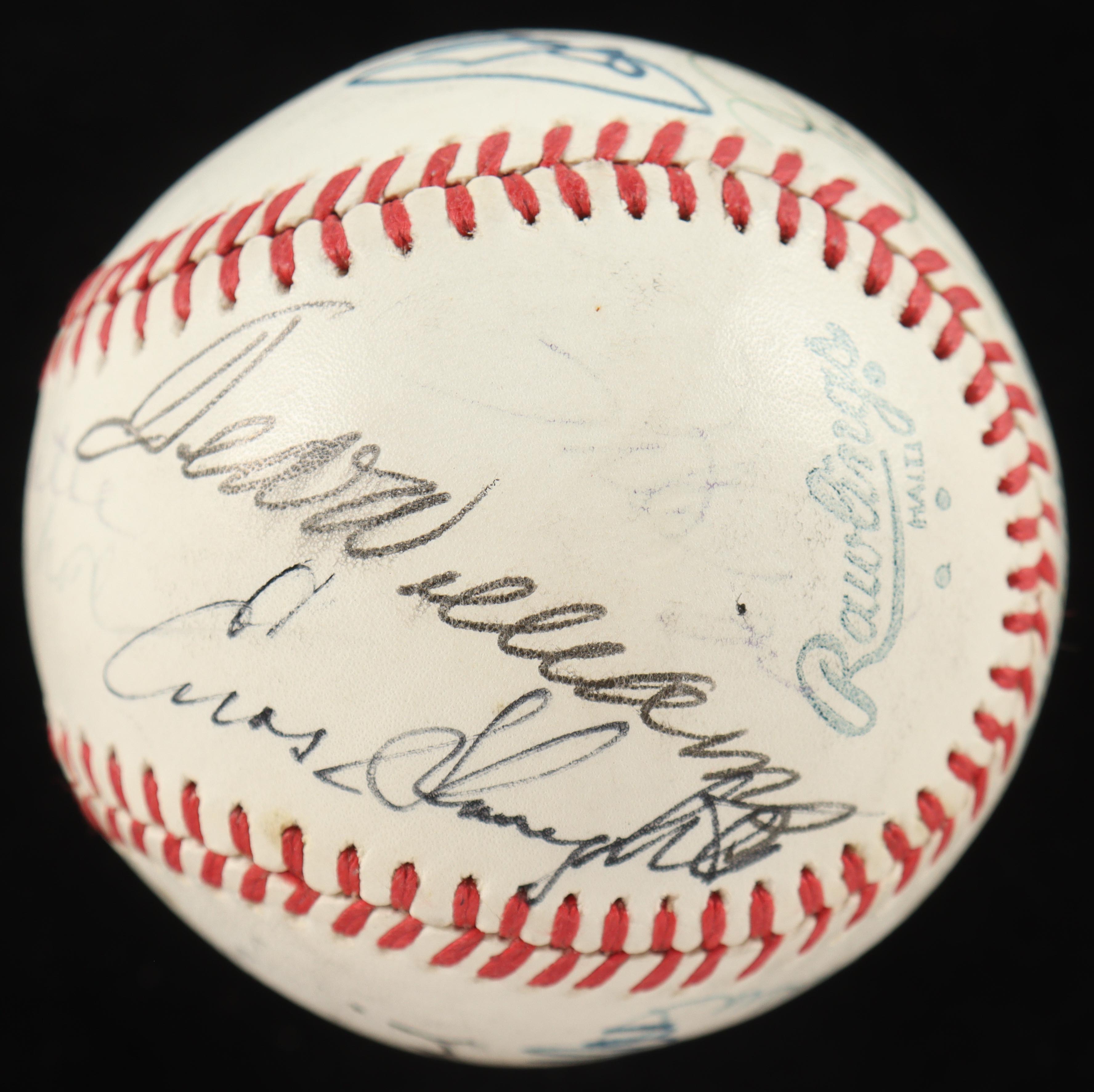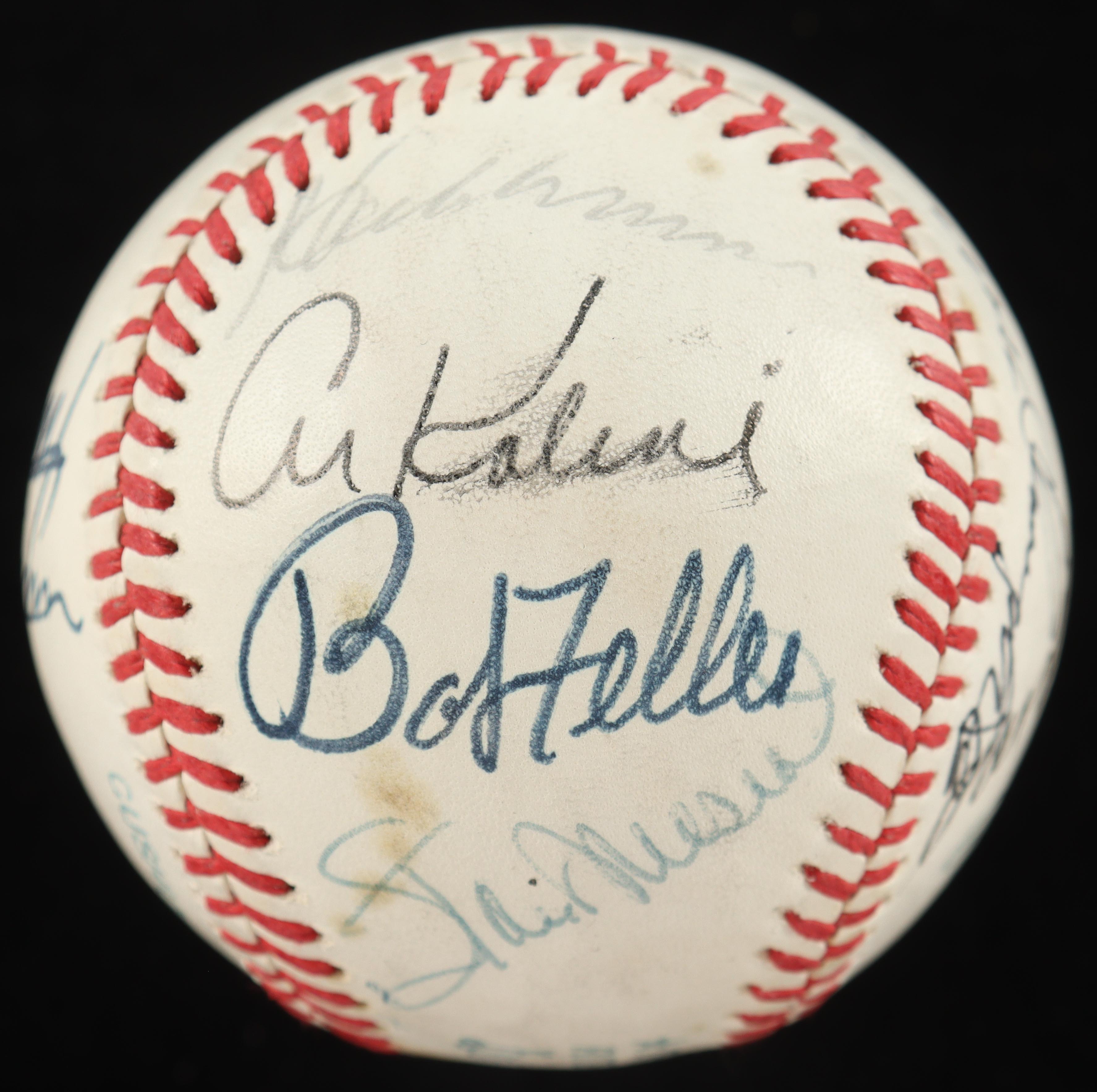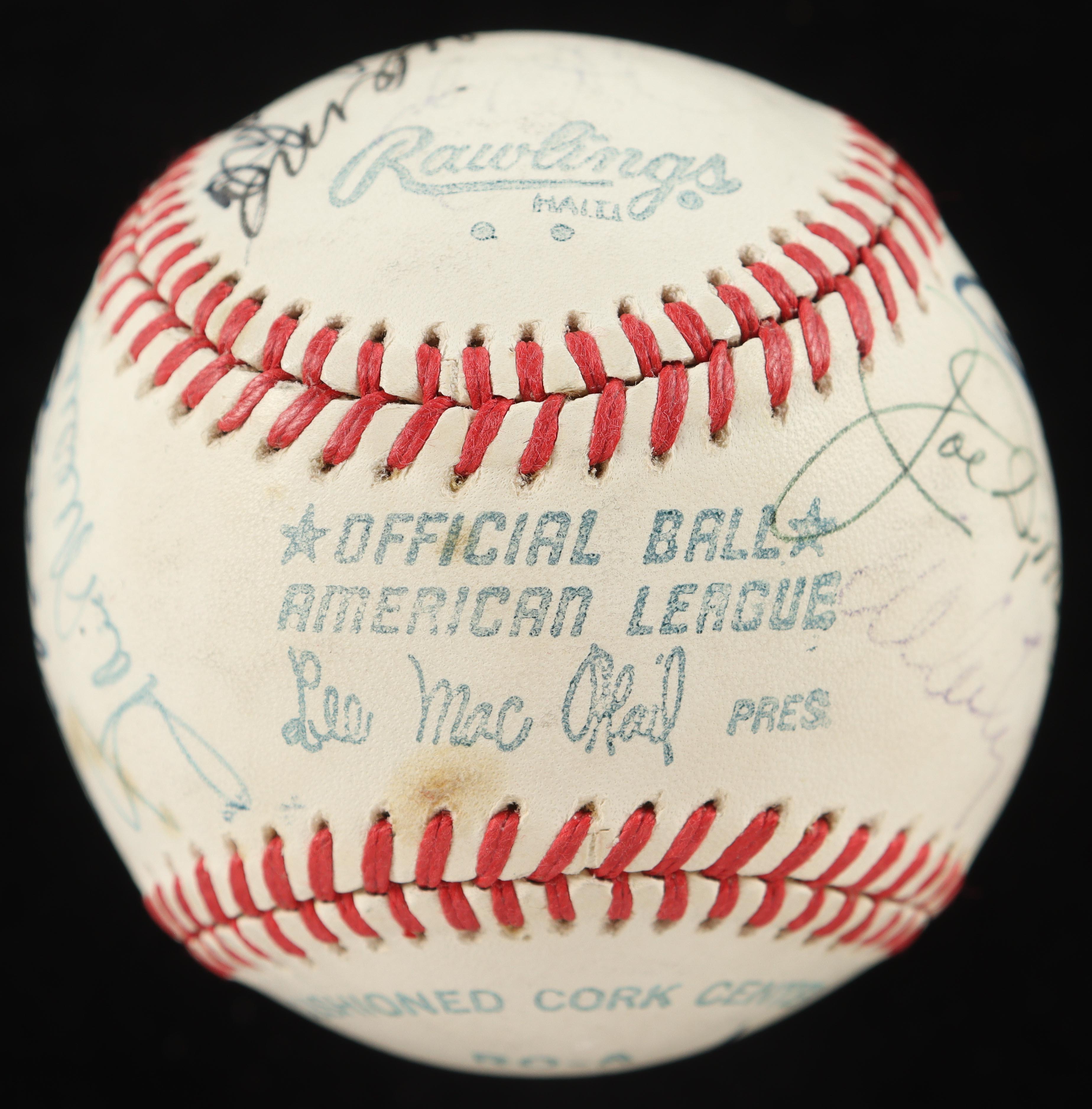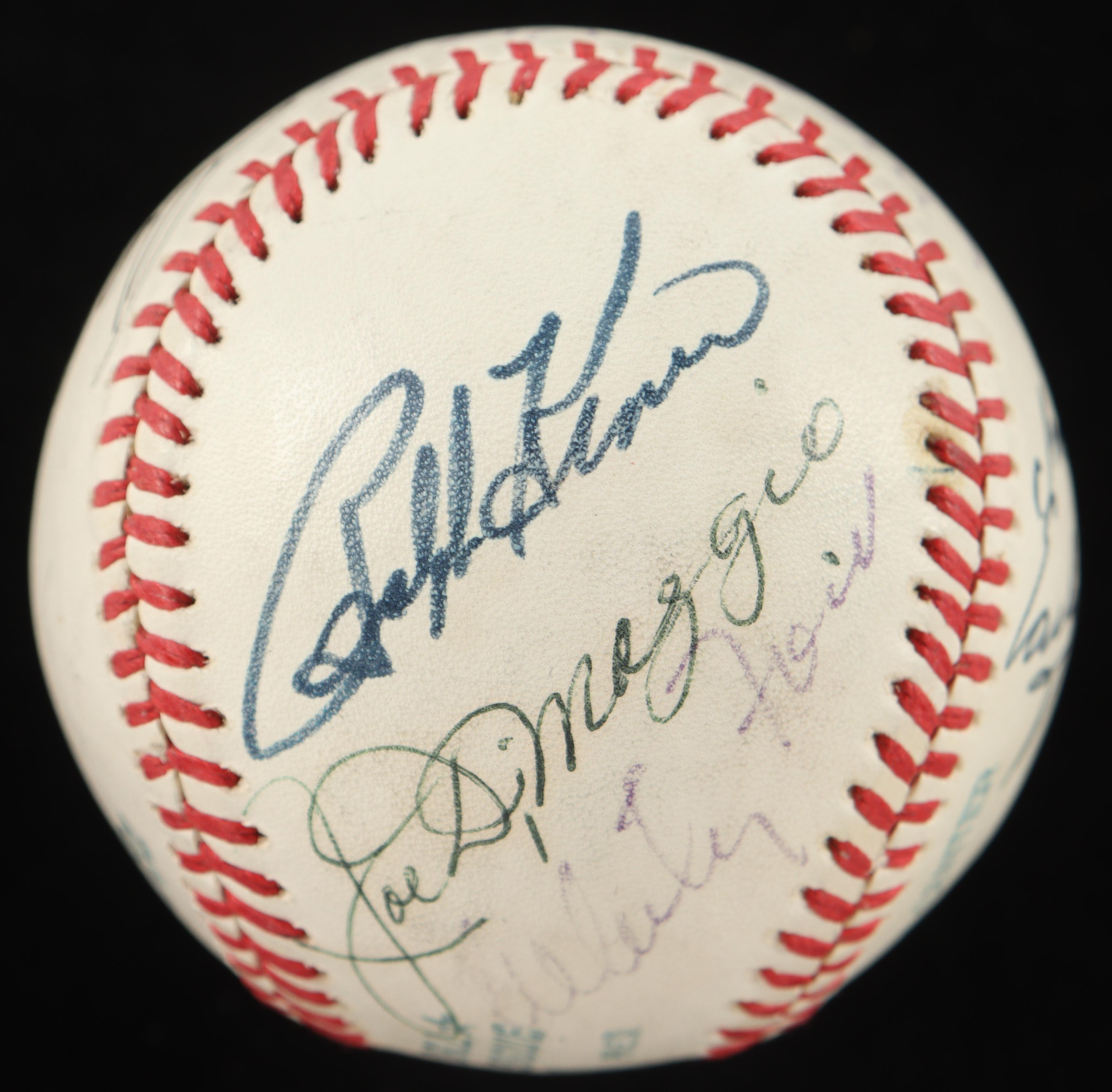 Other names on the baseball include Enos Slaughter, Joe DiMaggio, Whitey Ford, Ralph Kiner, Willie Mays, Early Wynn, Stan Musial, Bob Feller, Al Kaline, and Pete Rose!