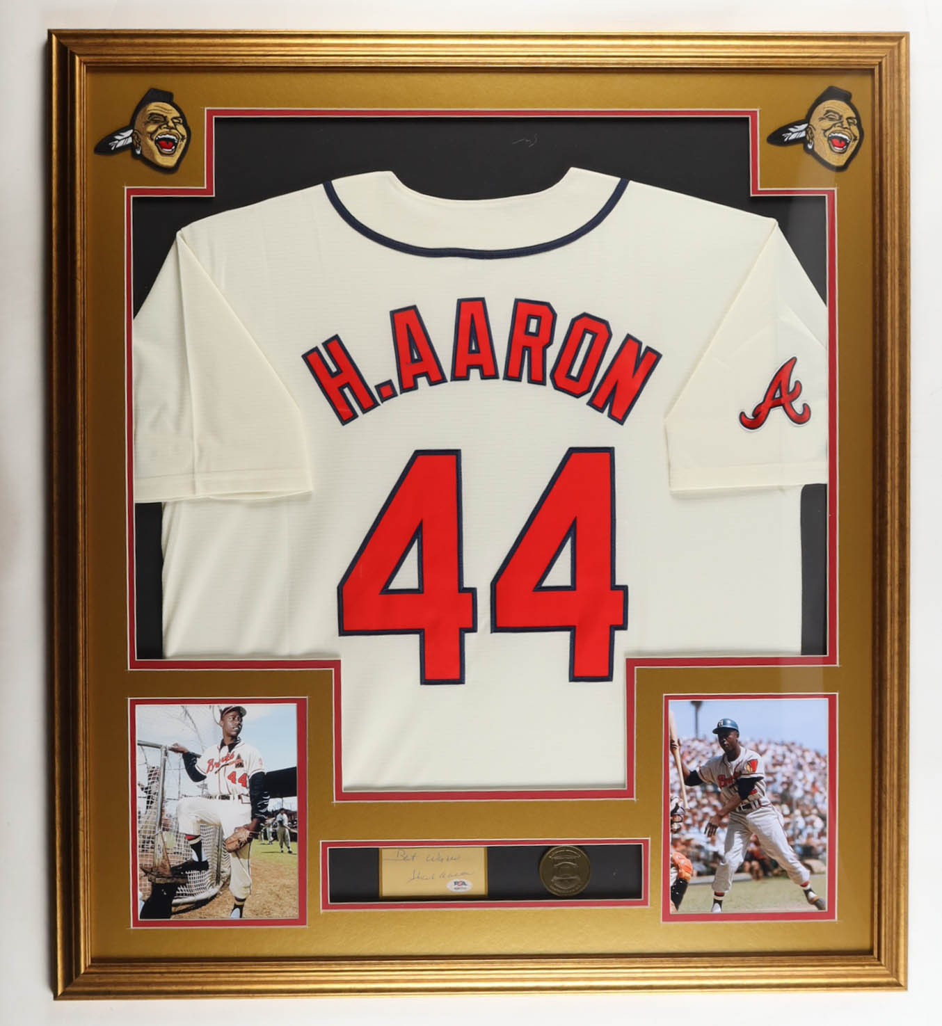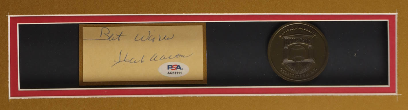 Hank Aaron Signed Custom Framed Cut Display Inscribed "Best Wishes" with Jersey & HOF Induction Emblem (PSA)