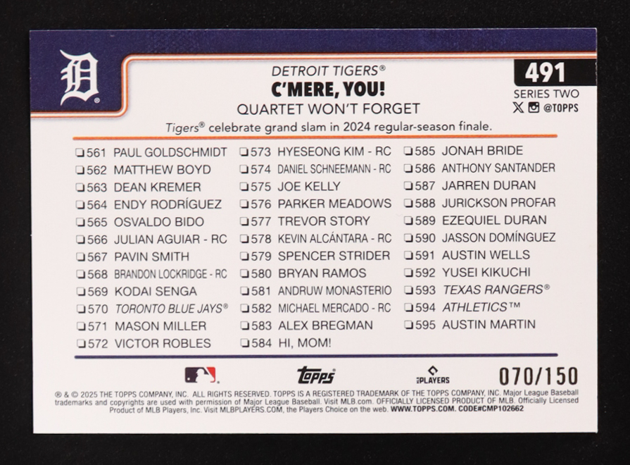 Spencer Torkelson / Trey Sweeney 2025 Topps Blue Holo Foil #491 C'Mere, You! #070/150