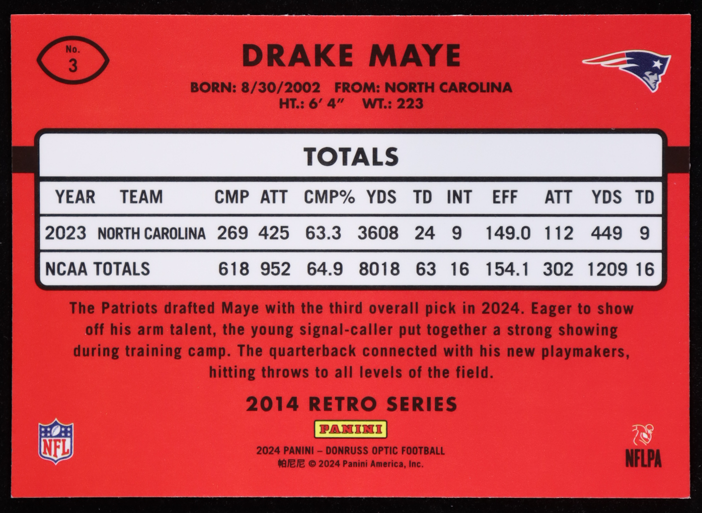 Drake Maye 2024 Donruss Optic '14 Retro Series #3 RC