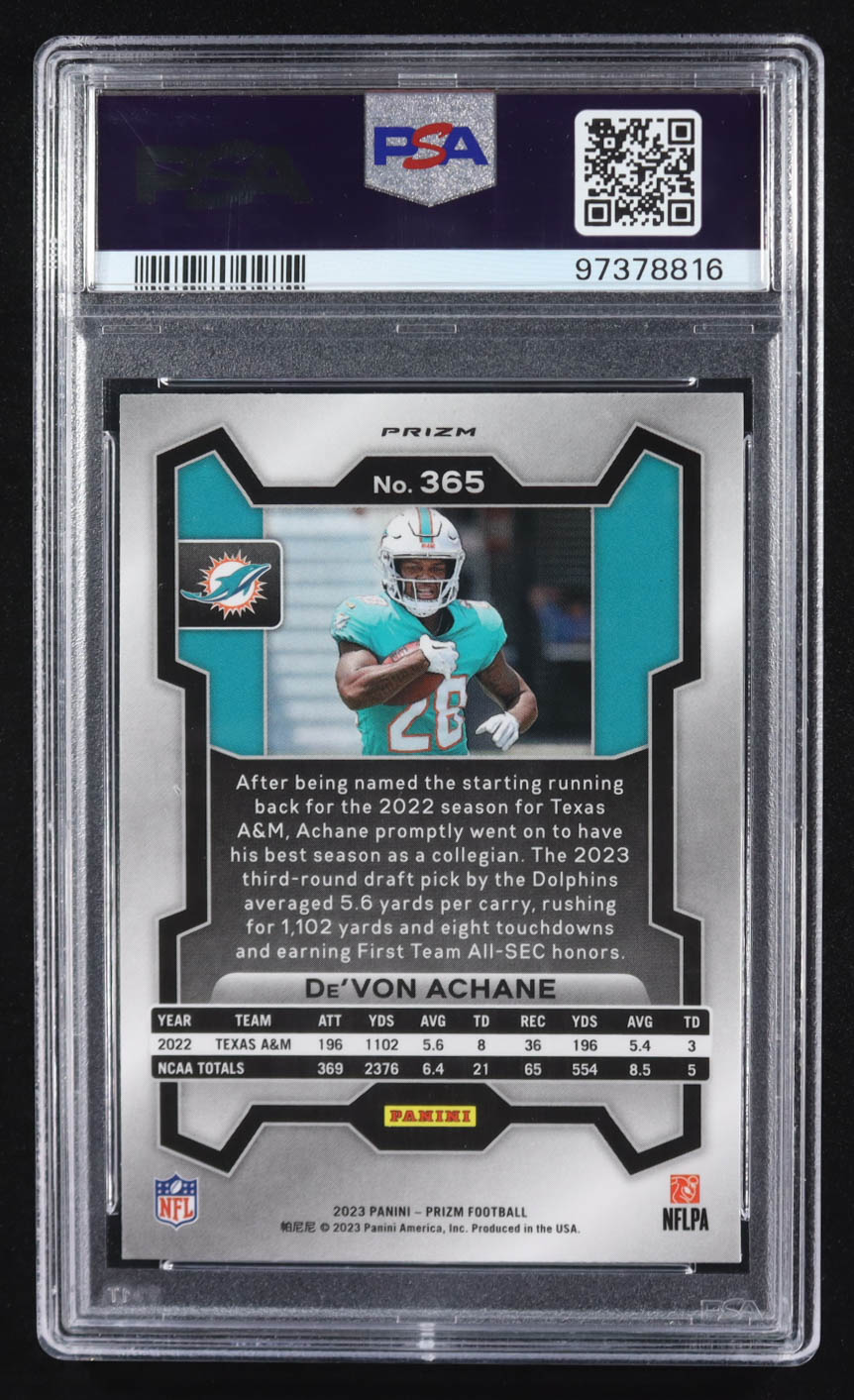 De'Von Achane 2023 Panini Prizm Silver #365 RC (PSA 10)