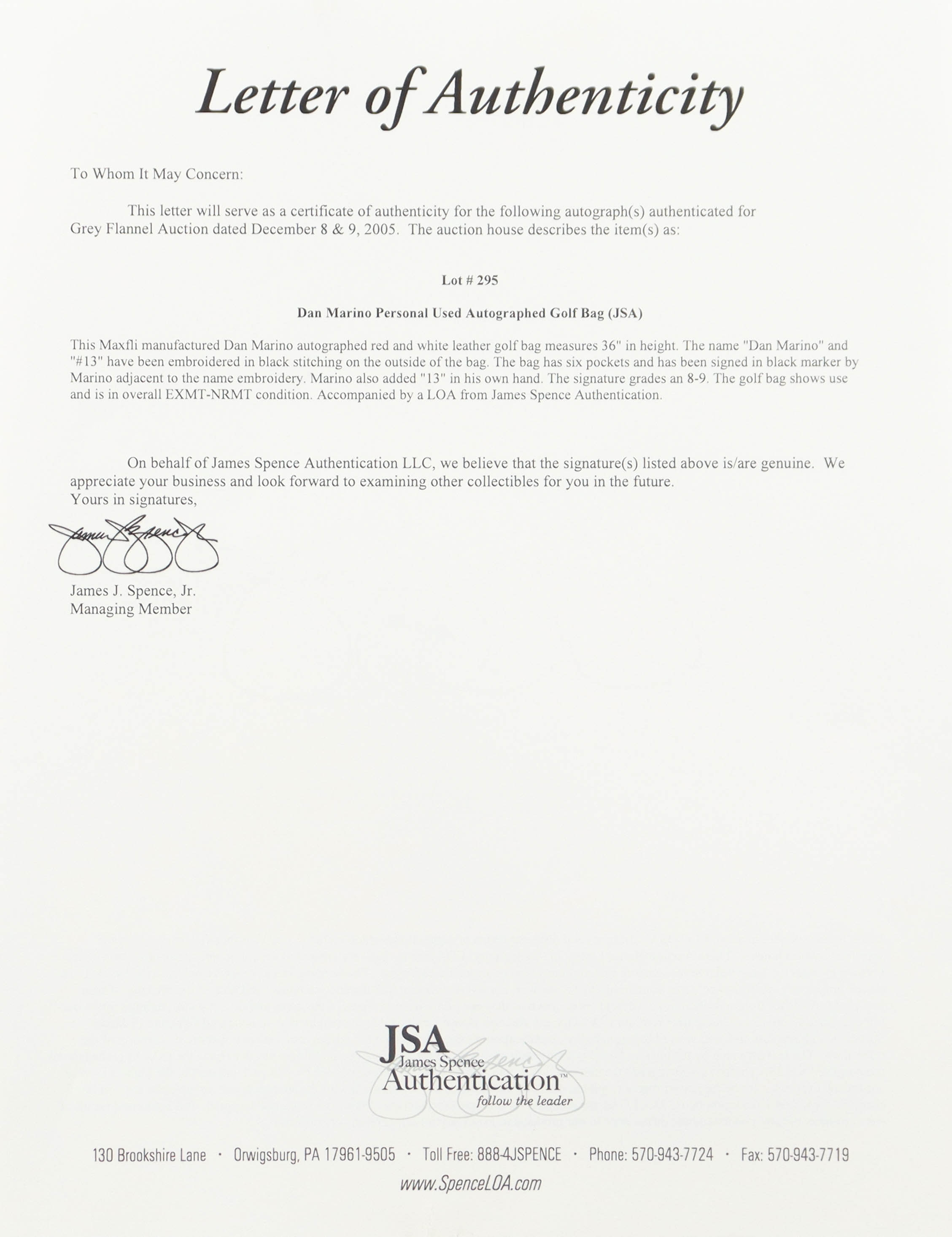 The golf bag includes a James Spence Authentication (JSA) Auction House LOA for authenticity purposes.