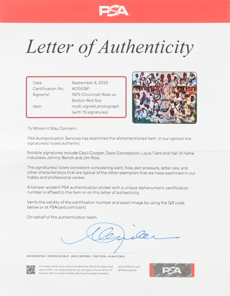 Custom frame measures approximately 24" x 26" in size and features a photo that has been hand-signed by (13) members of the 1975 Boston Red Sox and Cincinnati Reds including Hall of Famers Johnny Bench and Jim Rice!