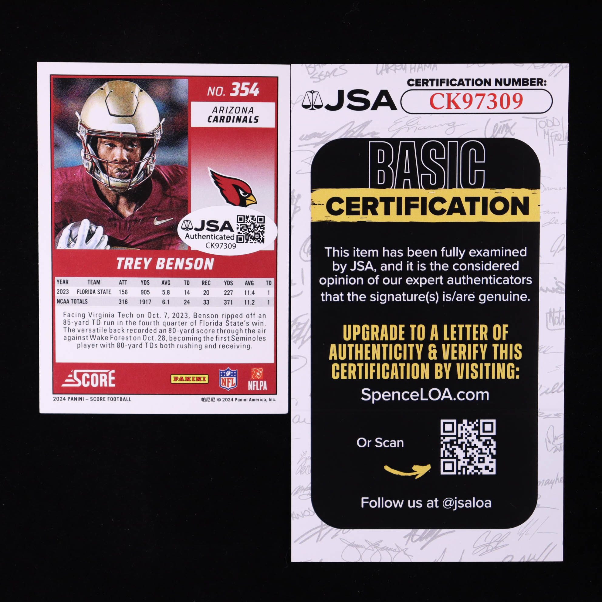 Trey Benson Signed 2024 Score #354 RC (JSA)