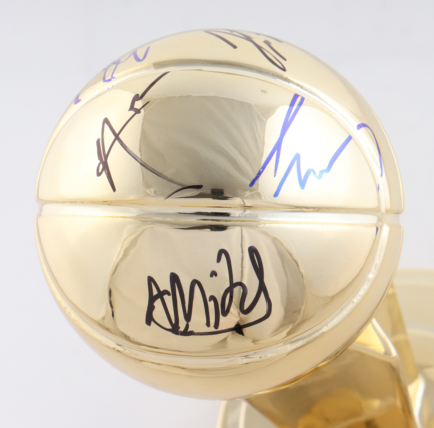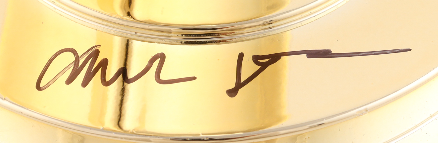 Replica NBA Finals trophy has been hand-signed by Shai Gilgeous-Alexander, Mark Daigeneault, Lu Dort, Ajay Mitchell, and Aaron Wiggins.