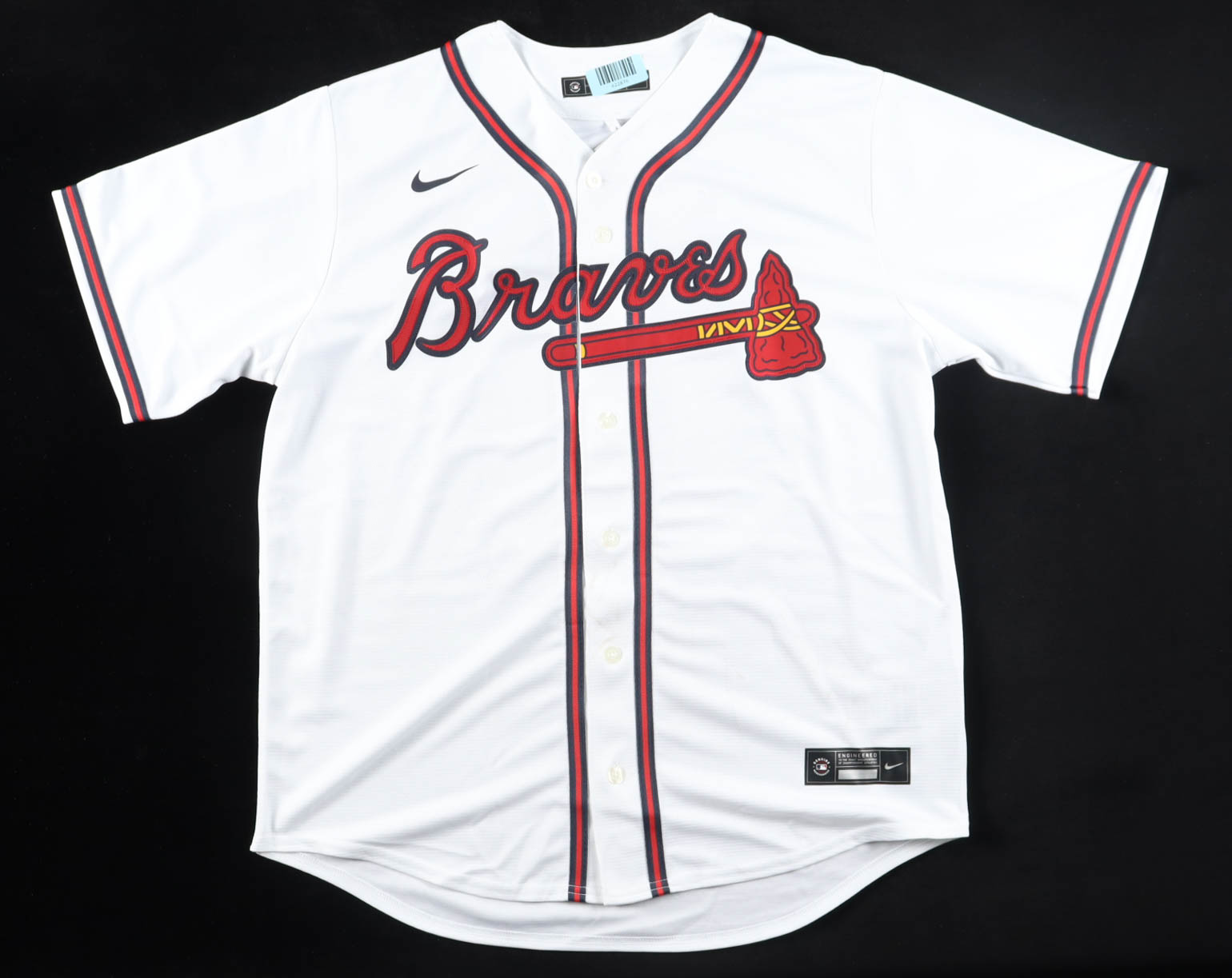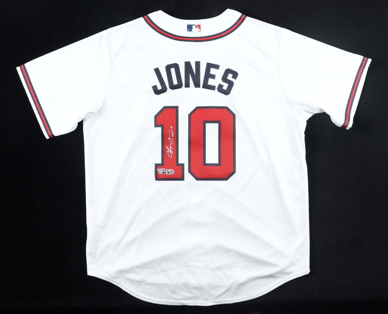 Nike authentic jersey with everything sewn on, size L. Hand-signed and inscribed by Chipper Jones (Atlanta Braves, HOF).