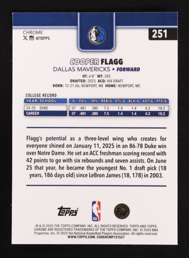 Cooper Flagg 2025-26 Topps Chrome #251 RC