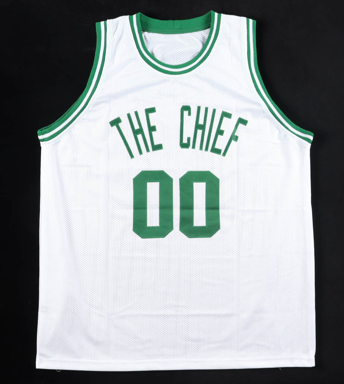 Custom jersey with everything sewn on, size XL. Hand-signed by Robert Parish (HOF).