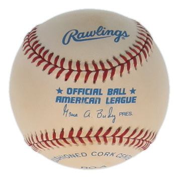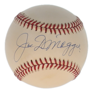 Rawlings Official American League baseball. Hand-signed by Joe DiMaggio (D. 1999, New York Yankees, HOF). Please note, baseball is naturally toned and has stains.