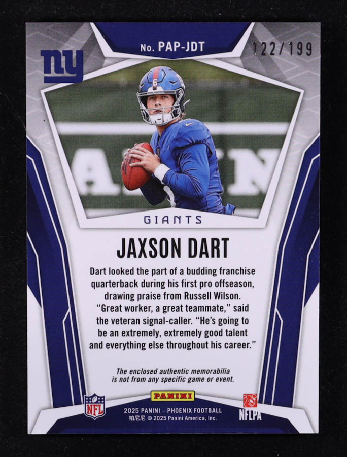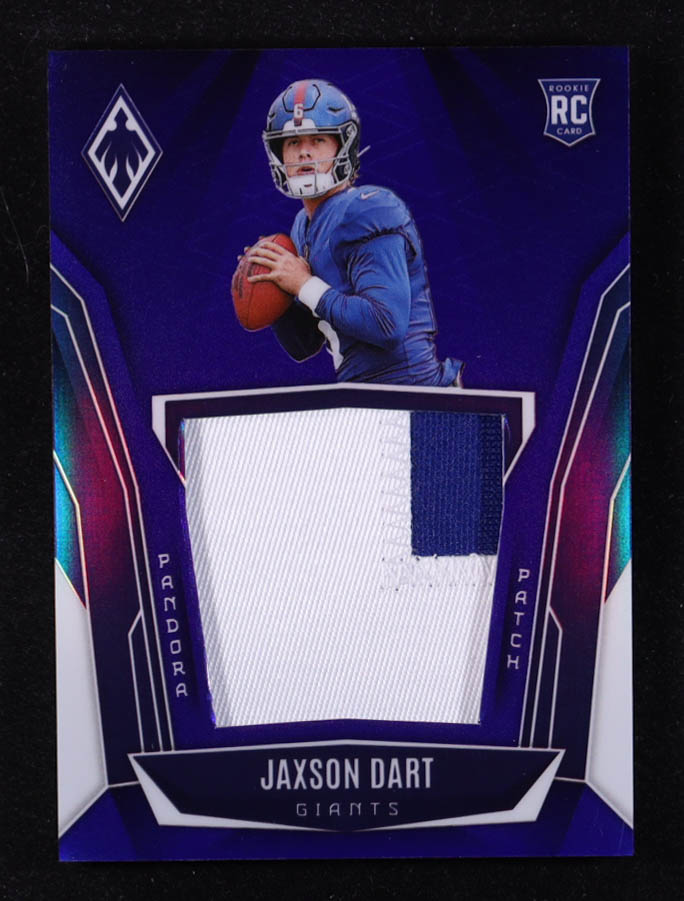 Jaxson Dart 2025 Panini Phoenix Pandora Patches Blue #16 RC #122/199