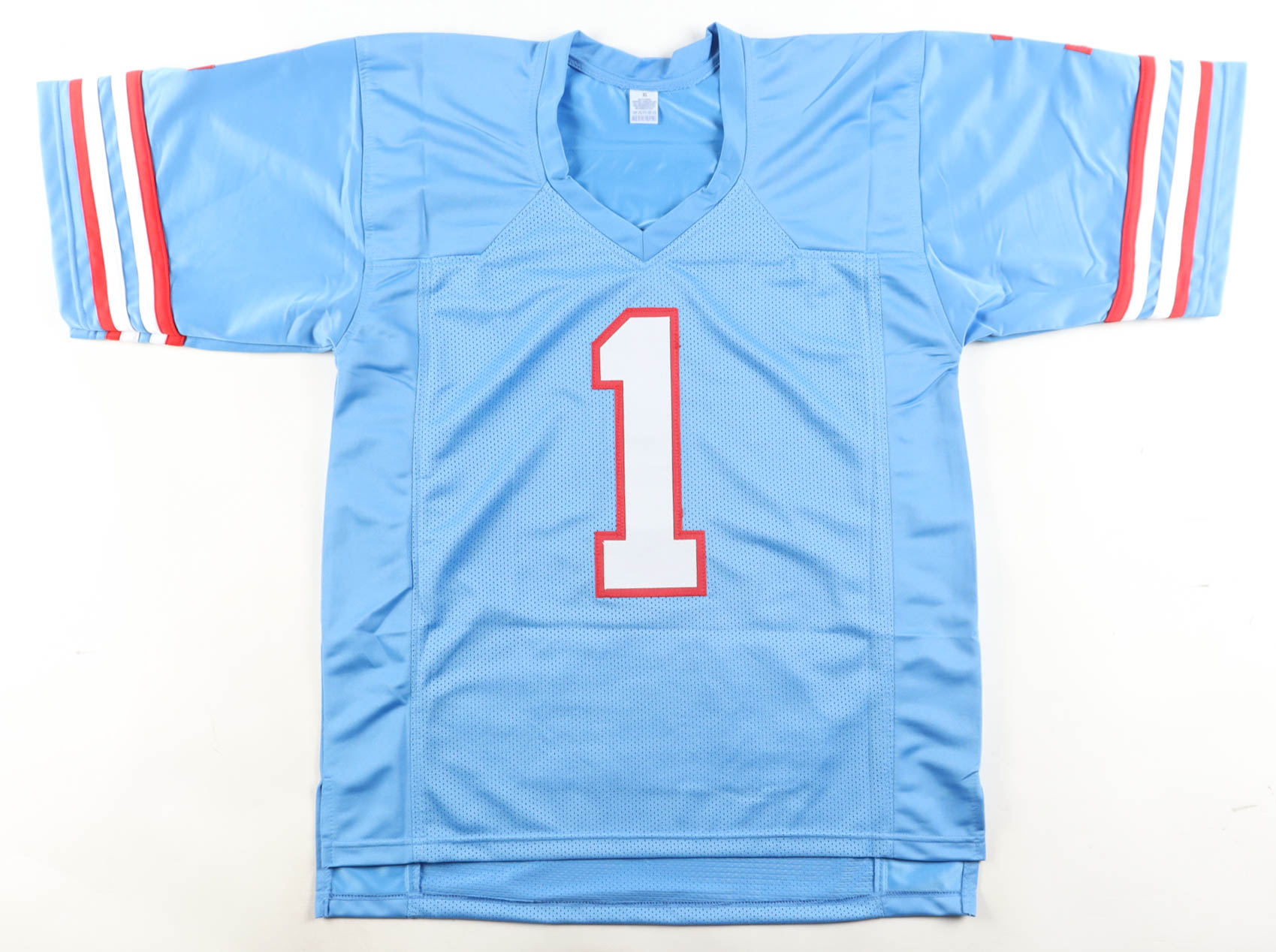 Custom jersey with everything sewn on, size XL. Hand-signed and inscribed by Warren Moon (Houston Oilers, HOF). Moon's career highlight statistics have been custom-stitched below the reverse number.