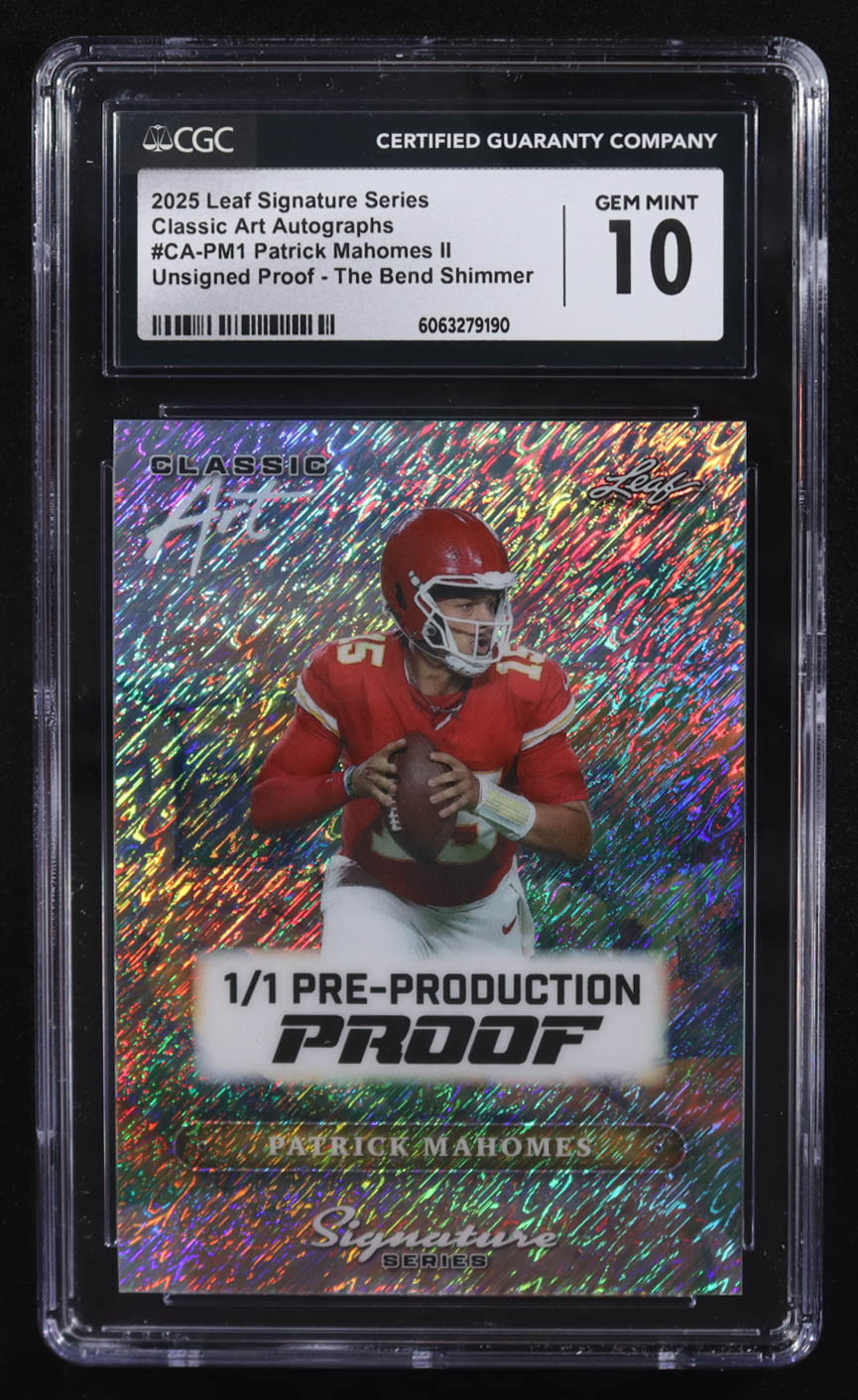 Patrick Mahomes II 2025 Leaf Signature Series Classic Art Autographs Pre Production Proof The Bend Shimmer Unsigned Proof #1/1 #CA-PM1 (CGC 10)