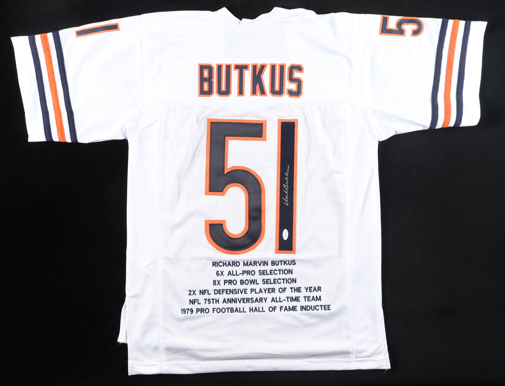 Custom jersey. Everything is sewn on, size XL. Hand-signed by Dick Butkus (HOF). Butkus's career highlights have been custom stitched onto the back of the jersey below the reverse numbers.