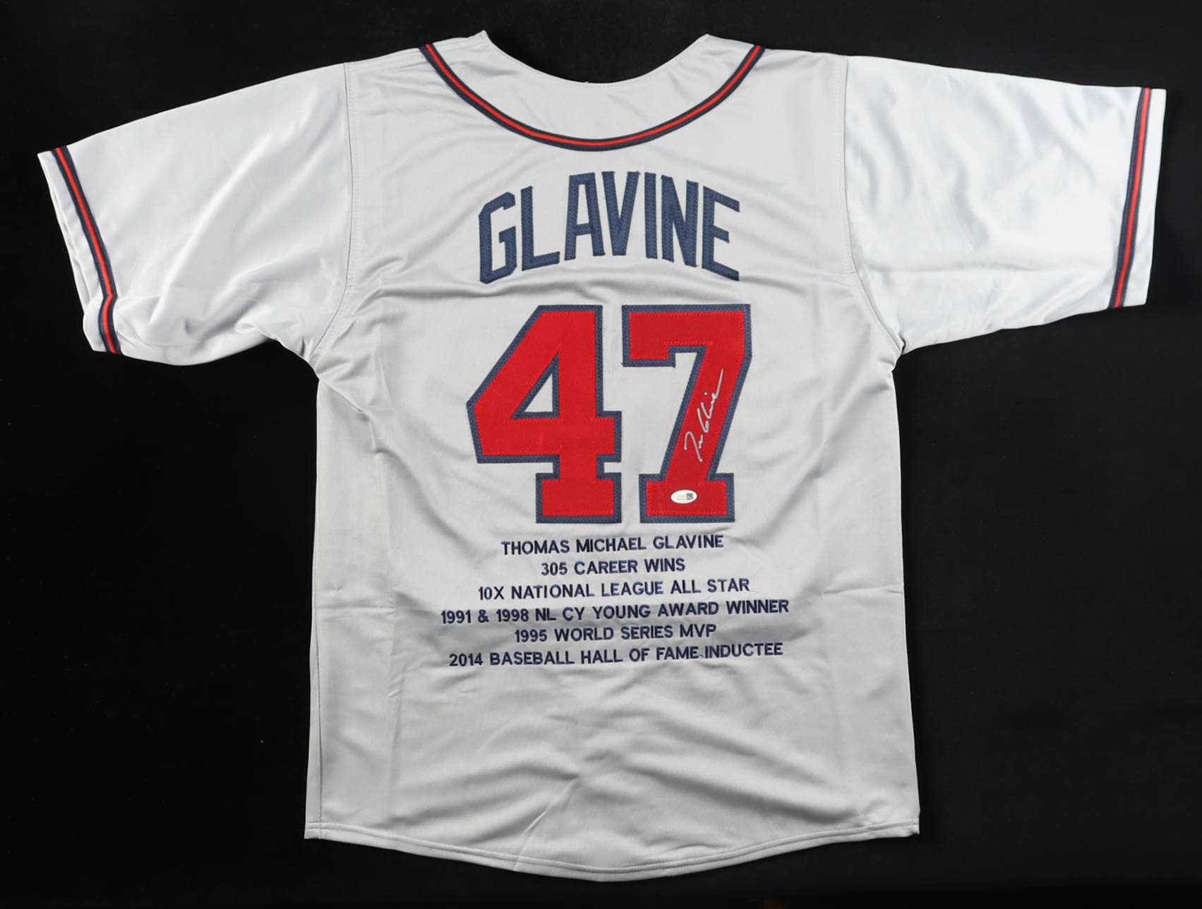 Custom jersey with everything sewn on, size XL. Hand-signed by Tom Glavine (HOF). Glavine's career highlights have been custom stitched onto the back of the jersey below the reverse numbers.