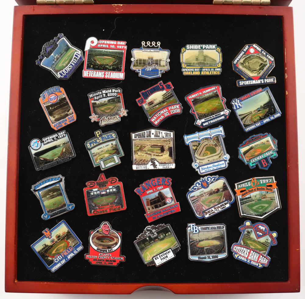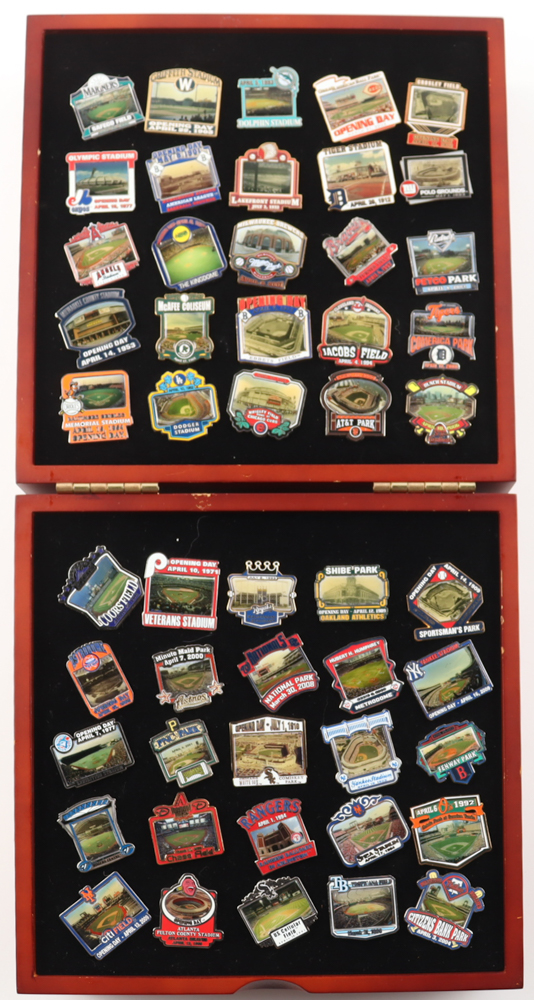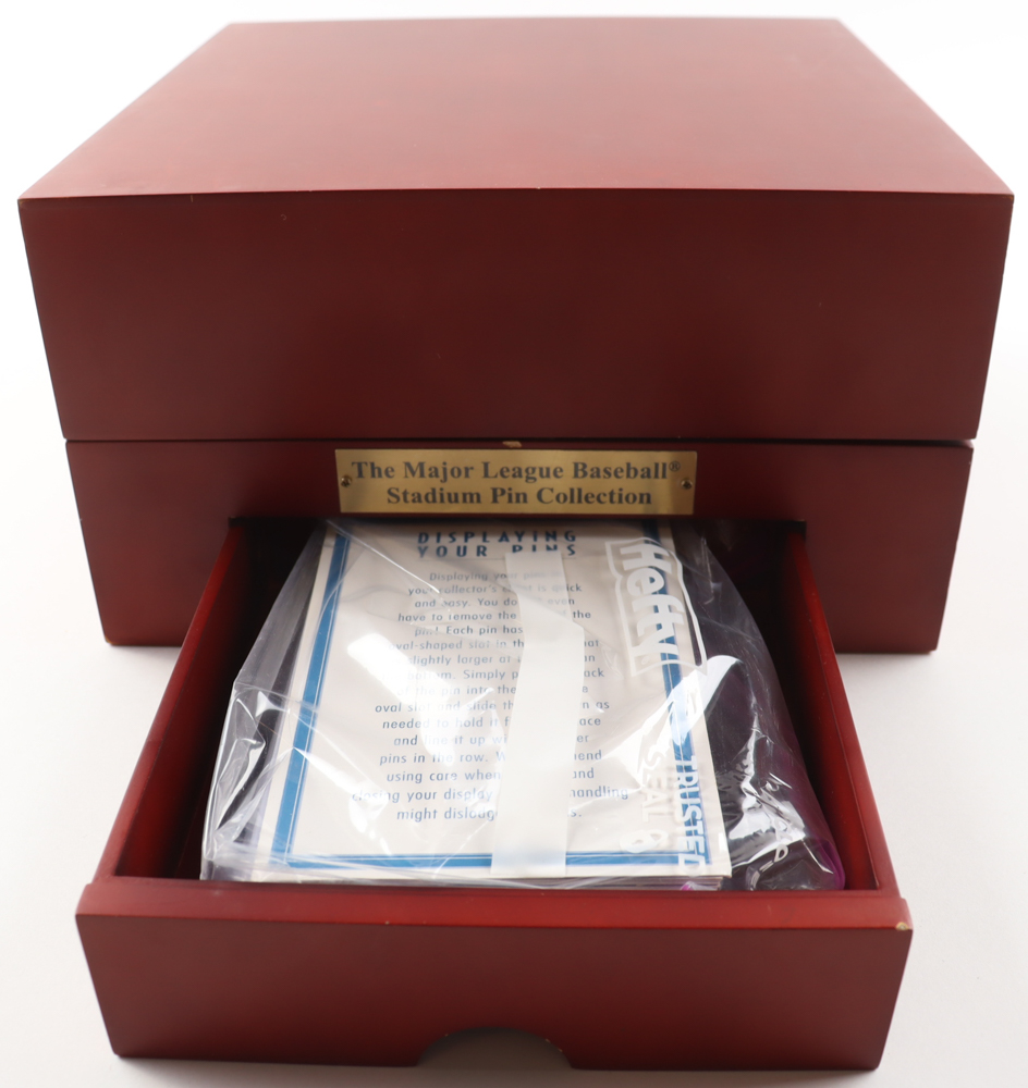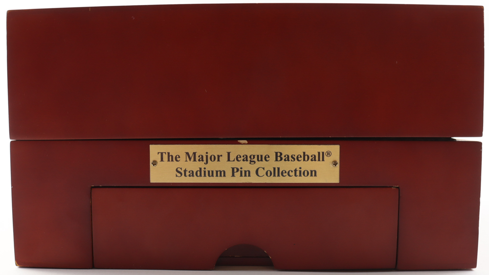 Willabee and Ward Baseball Stadiums Complete Pin Set includes all (50) pins as shown. Includes wooden display box as shown.