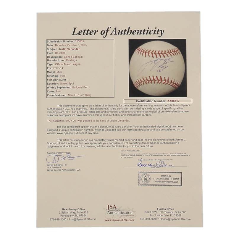Justin Verlander Signed OML Baseball Inscribed "ROY 06" (JSA)