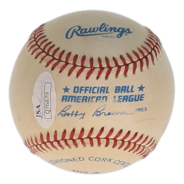 Rawlings Official American League Baseball. Hand-signed by Yogi Berra (D. 2015, New York Yankees, HOF). Please note, the baseball is naturally toned and stained.