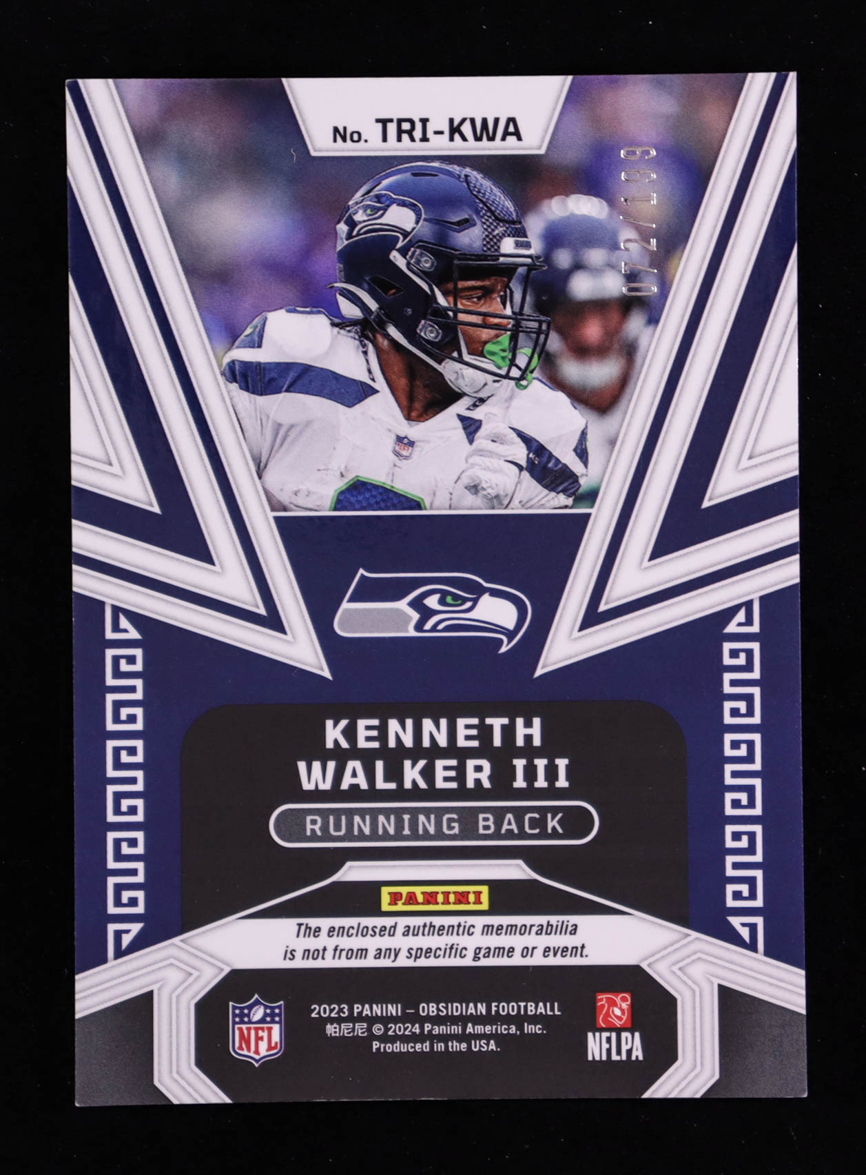 Kenneth Walker III 2023 Panini Obsidian Trifecta Swatches #15 #072/199