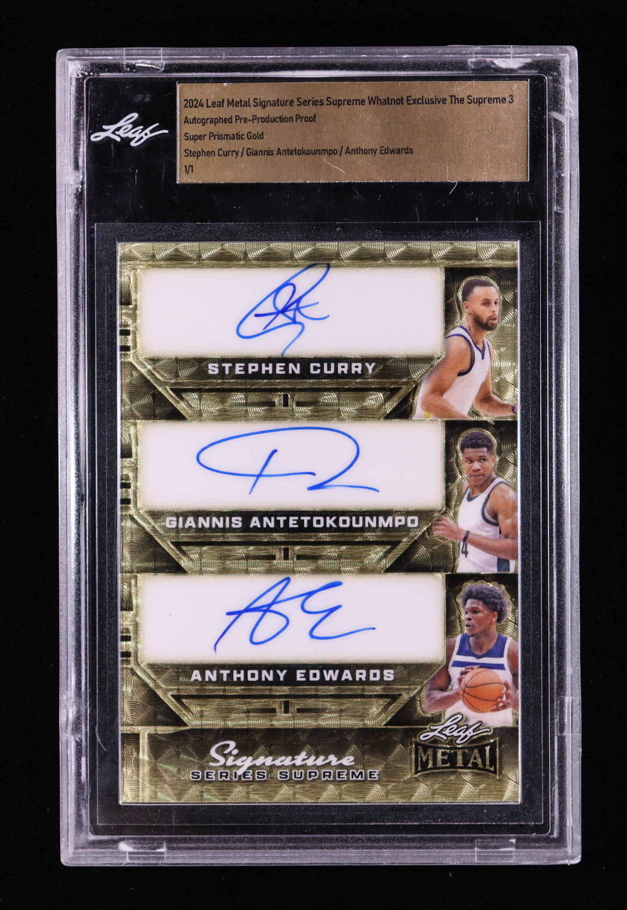 Stephen Curry / Giannis Antetokounmpo / Anthony Edwards 2024 Leaf Metal Signature Series Supreme Whatnot Exclusive The Supreme 3 Autographed Pre-Production Proof Super Prismatic Gold #1/1 (Leaf)