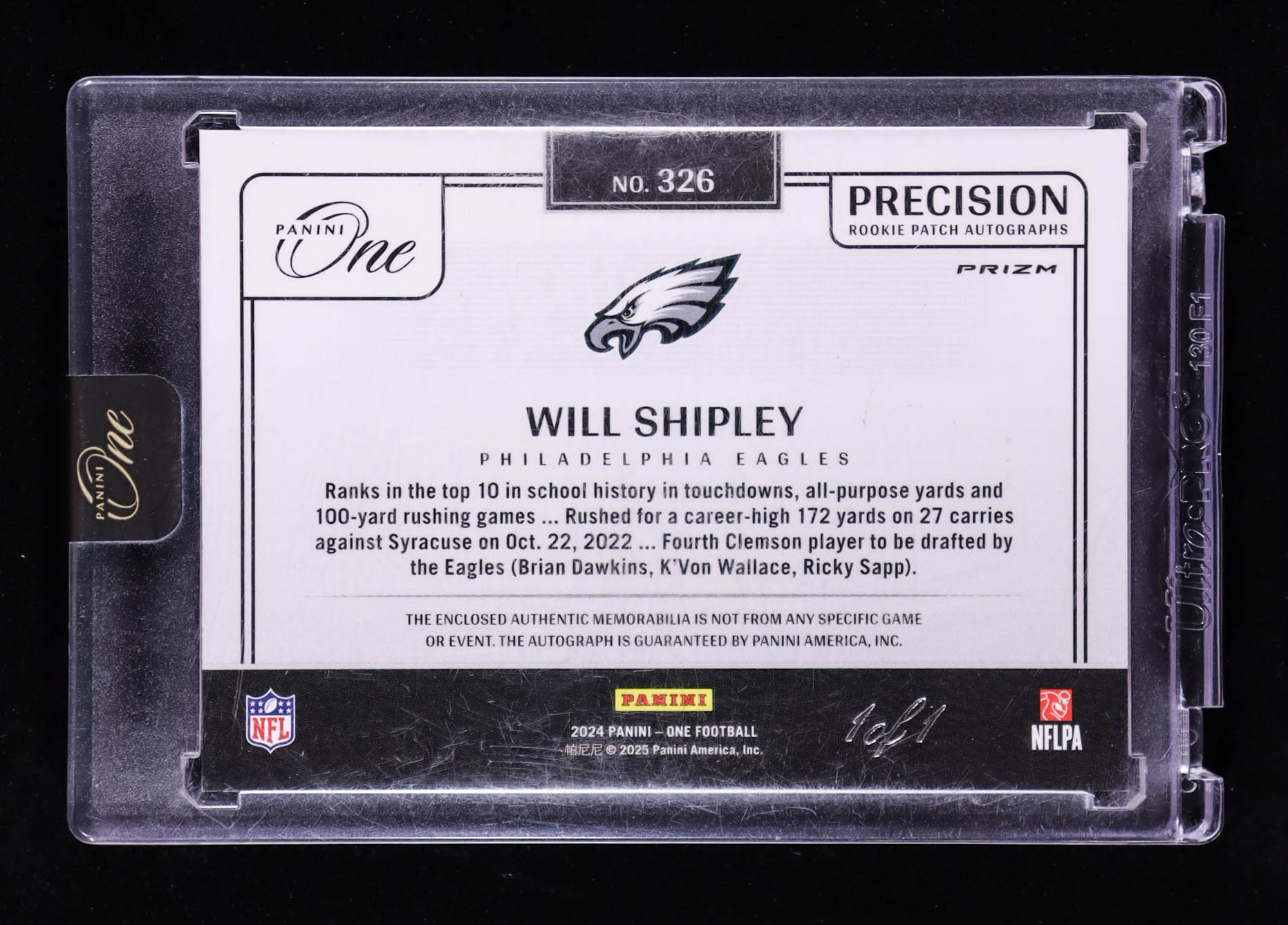 Will Shipley 2024 Panini One Precision Rookie Patch Autographs Black #326 #1/1 RC