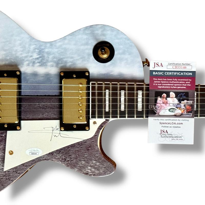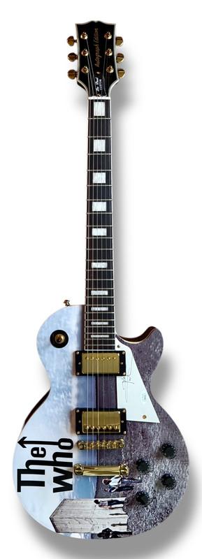 Custom Autograph Edition Les Paul style electric guitar measures approximately 39" in length and has been hand-signed on the pickguard by Pete Townshend (lead guitarist).
