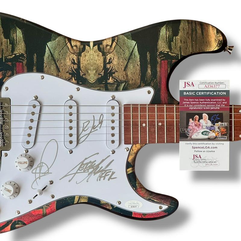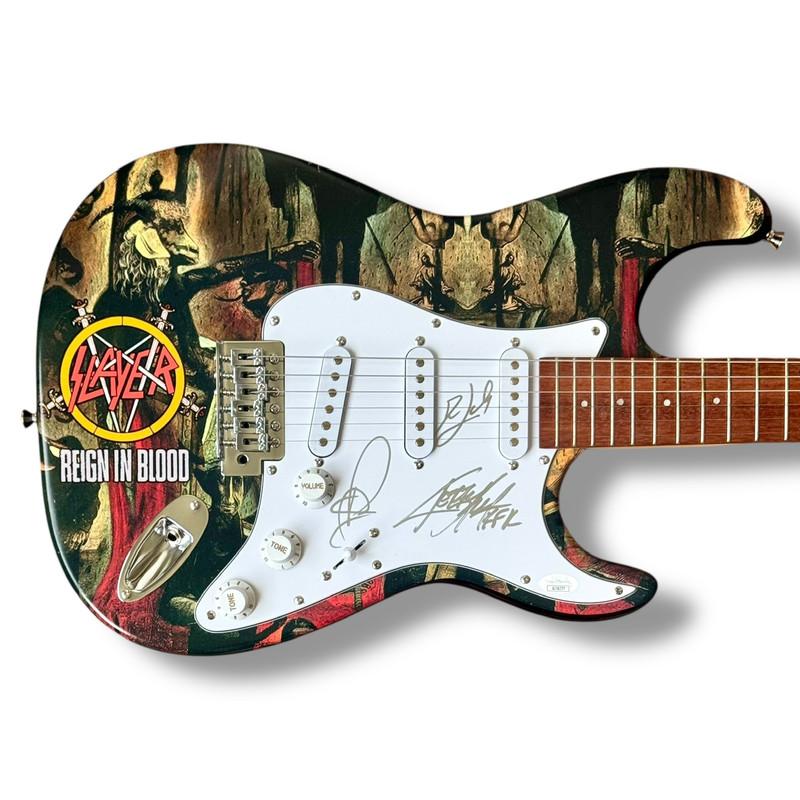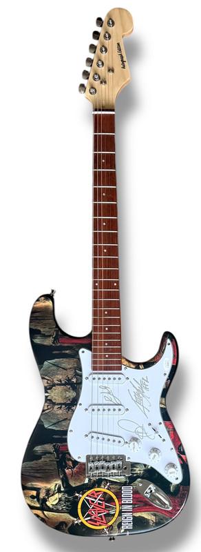 Custom Autograph Edition Stratocaster style electric guitar measures approximately 39" in length and has been hand-signed on the pickguard by Kerry King (lead guitarist), Tom Araya (lead singer & bassist), and Dave Lombardo (drummer).