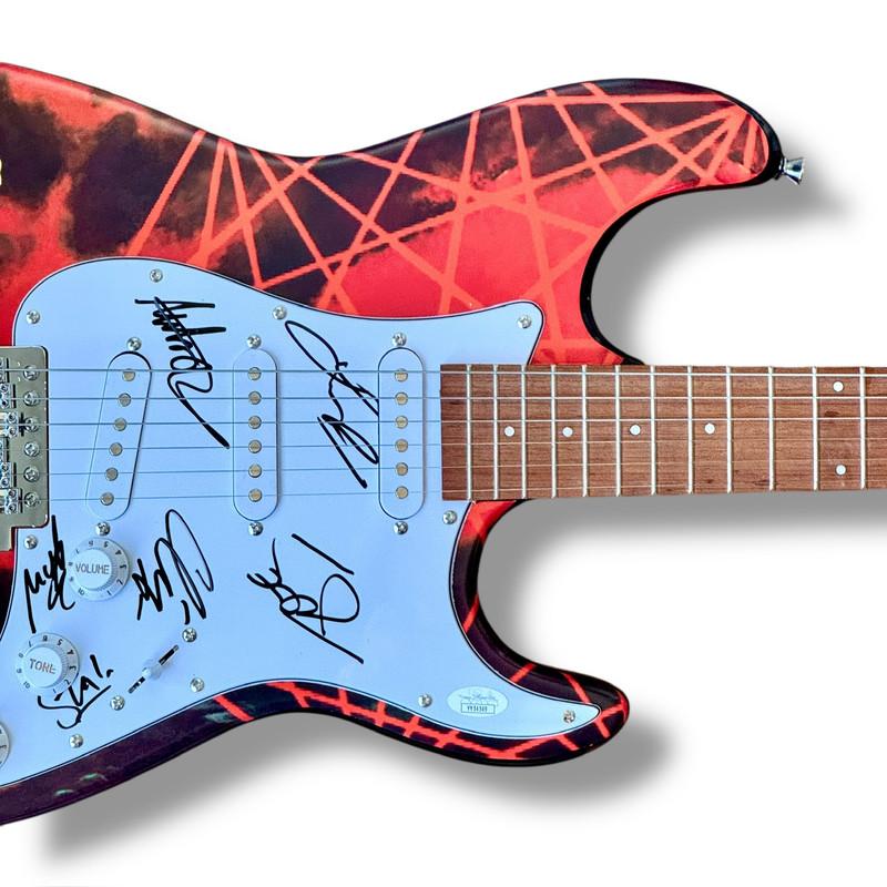 Custom Autograph Edition Stratocaster style electric guitar measures approximately 39" in length and has been hand-signed on the pickguard by Michael Cavanagh (drummer), Amrose Kenny-Smith (harmonica & organ), Stu Mackenzie (lead vocals & guitar), Joey Walker (guitarist), Cook Craig (guitarist), and Lucas Skinner (bassist).