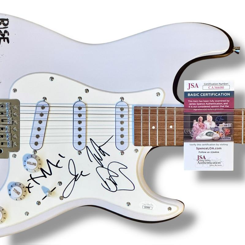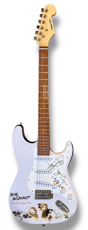 Custom Autograph Edition Stratocaster style electric guitar measures approximately 39" in length and has been hand-signed on the pickguard by Tim McIlrath (lead singer), Zach Blair (lead guitarist), Brandon Barnes (drummer), and Joe Principe (bassist).