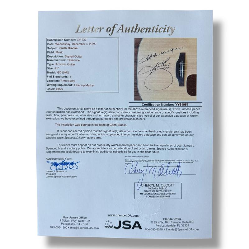 Full Size Takamine G-Series Acousitc guitar measures approximately 41" in length and has been hand-signed on the guitar body by Garth Brooks.