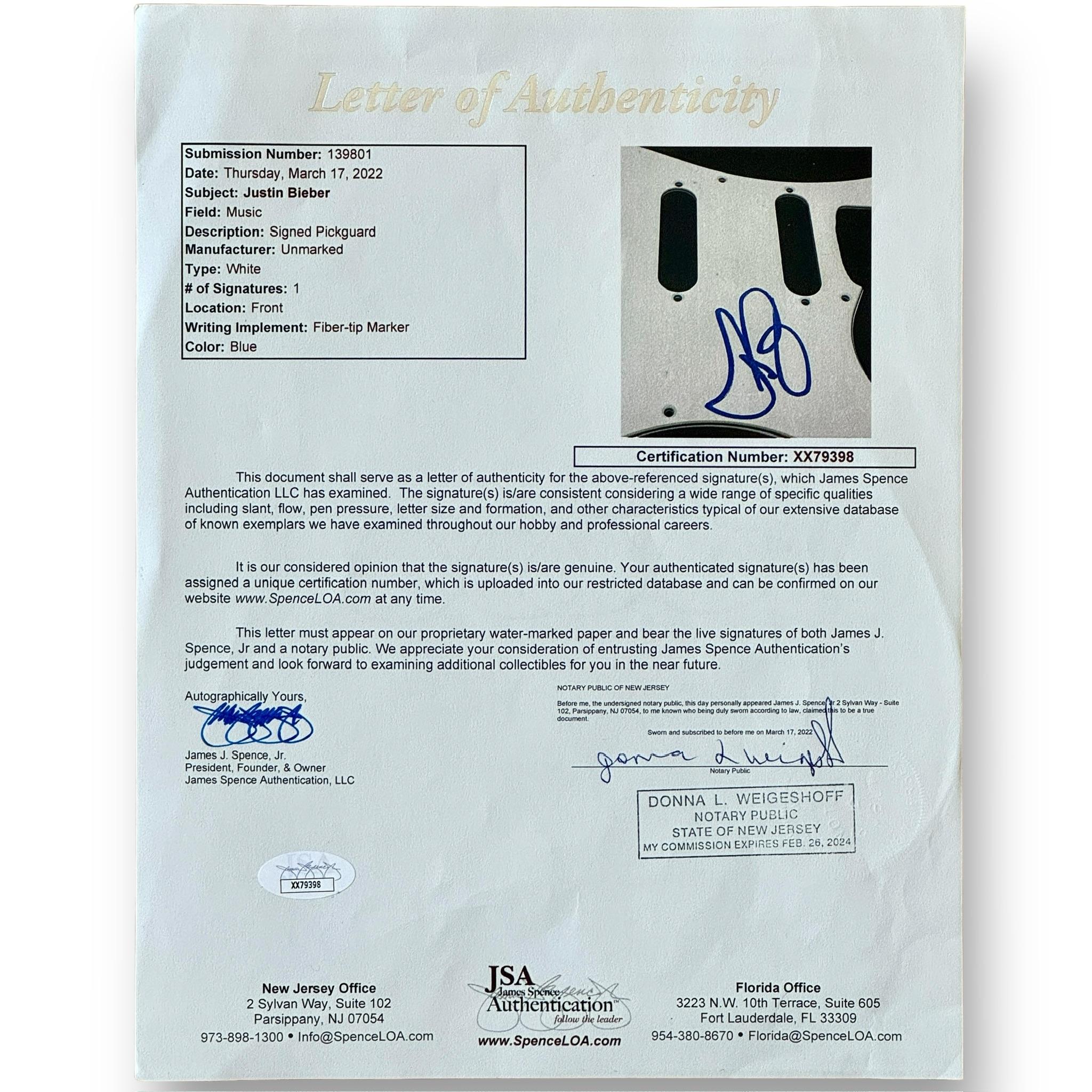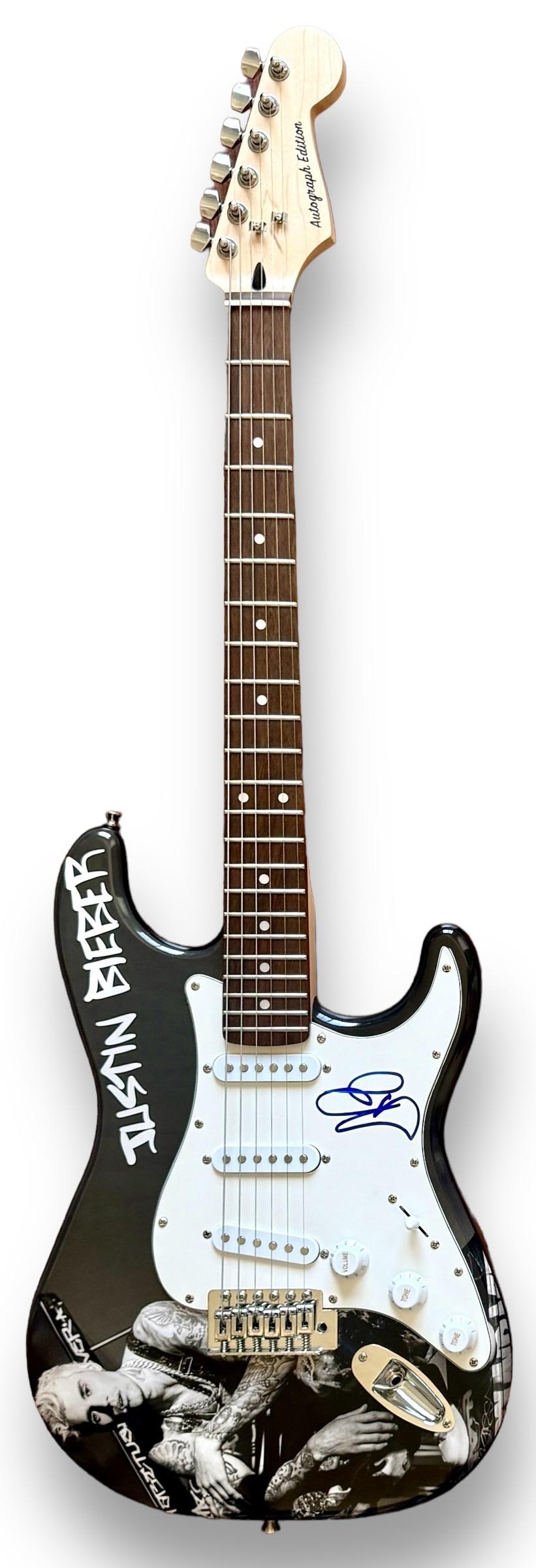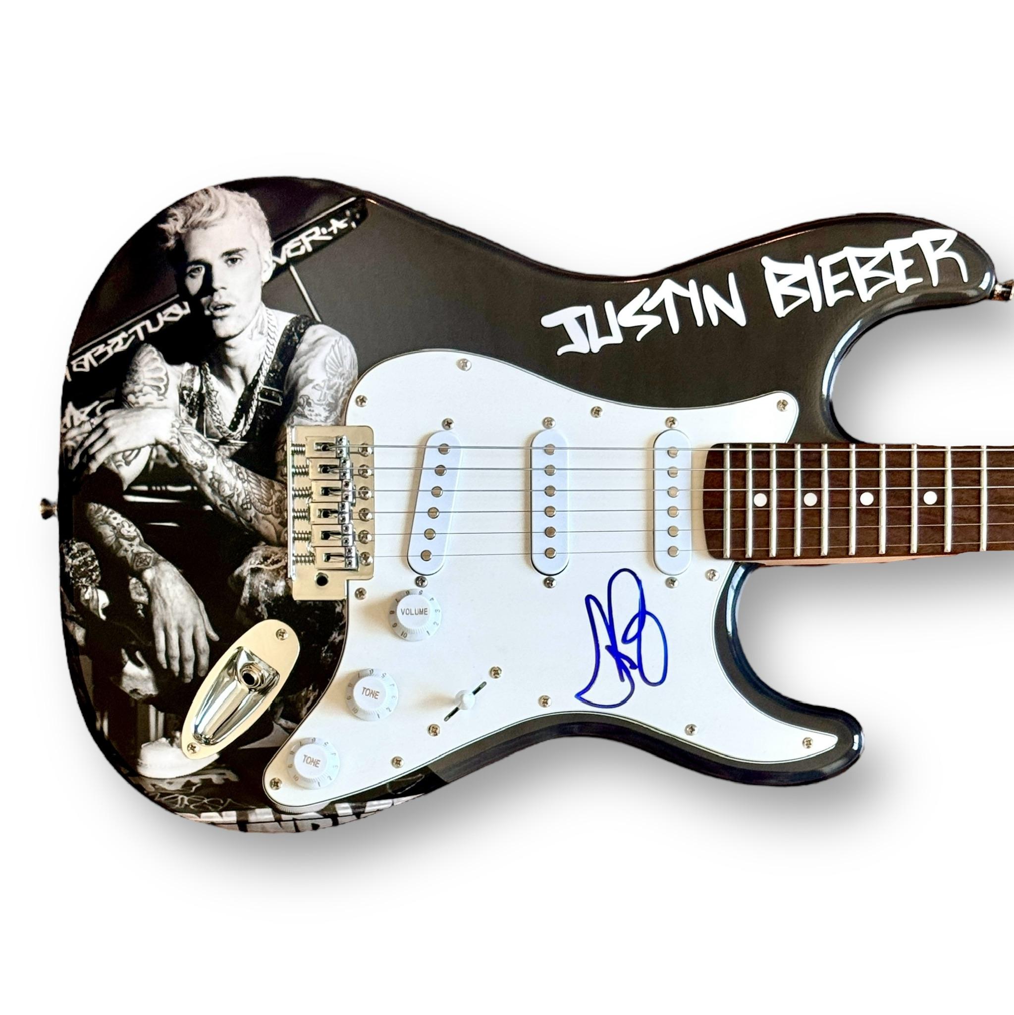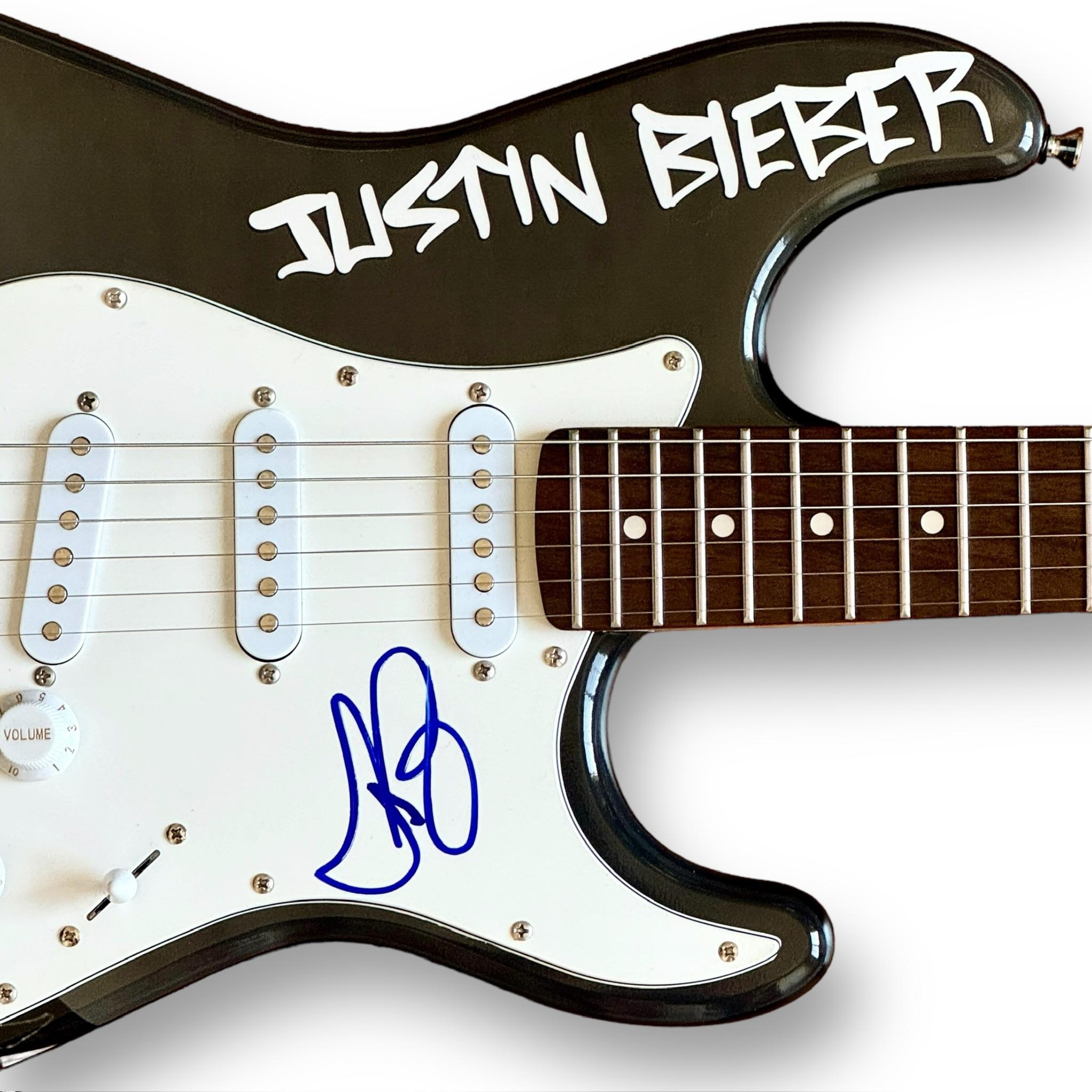 Custom Autograph Edition Stratocaster style electric guitar measures approximately 39" in length and has been hand-signed on the pickguard by Justin Bieber.