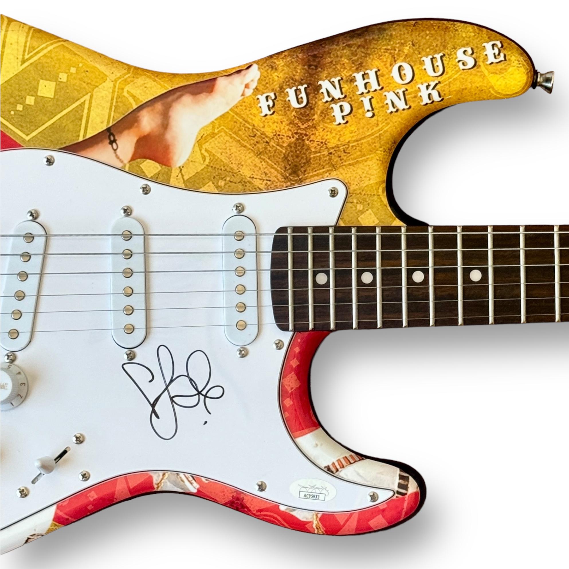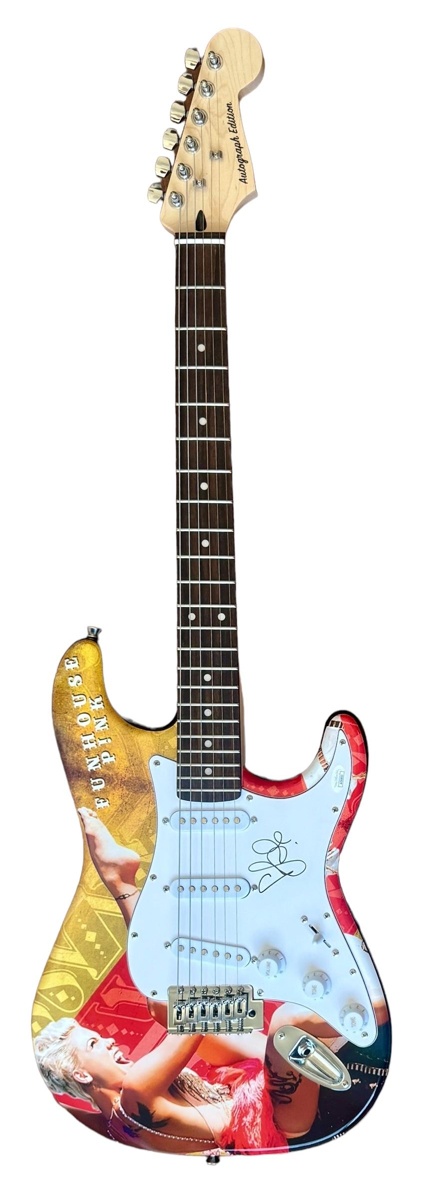 Custom Autograph Edition Stratocaster style electric guitar measures approximately 39" in length and has been hand-signed on the pickguard by Pink.